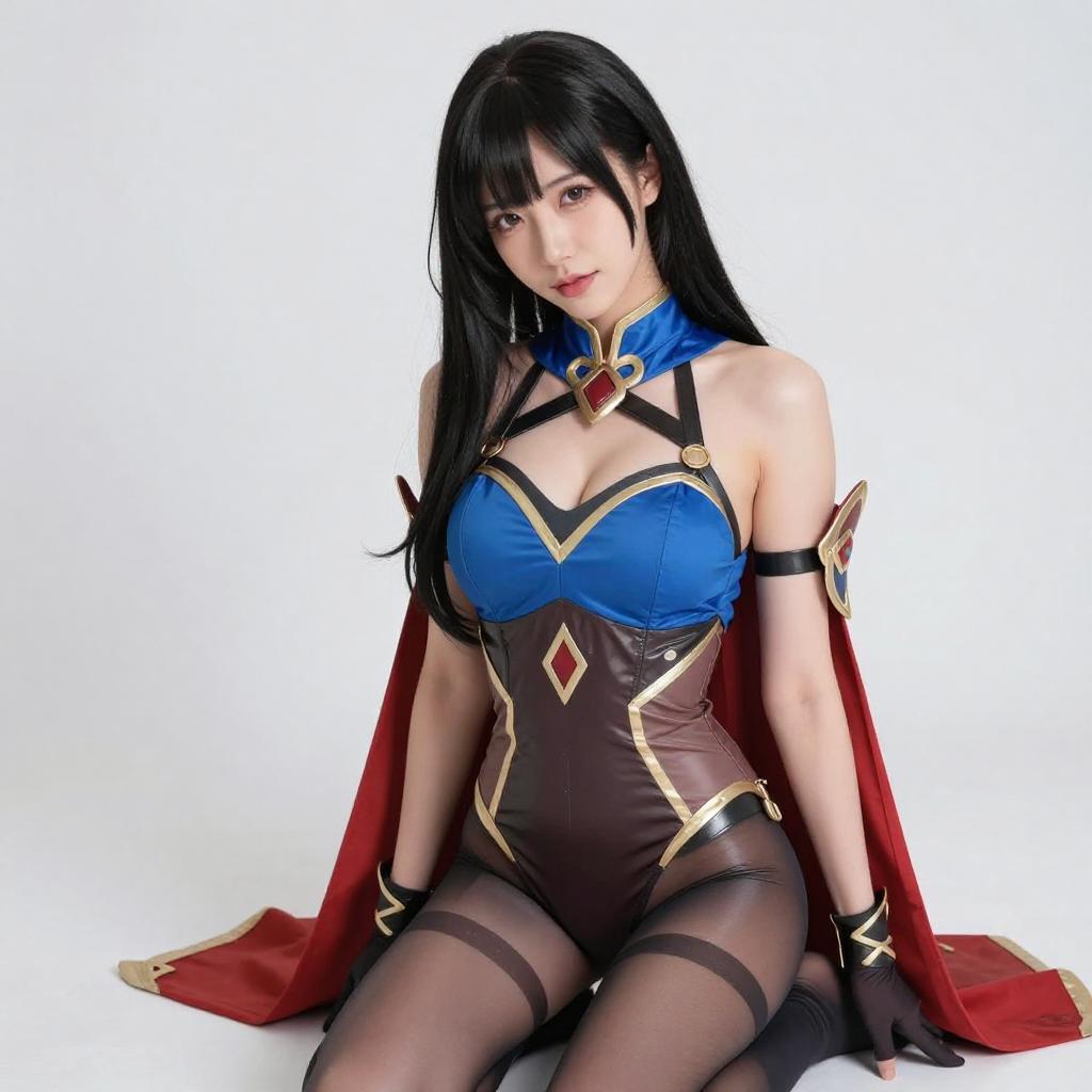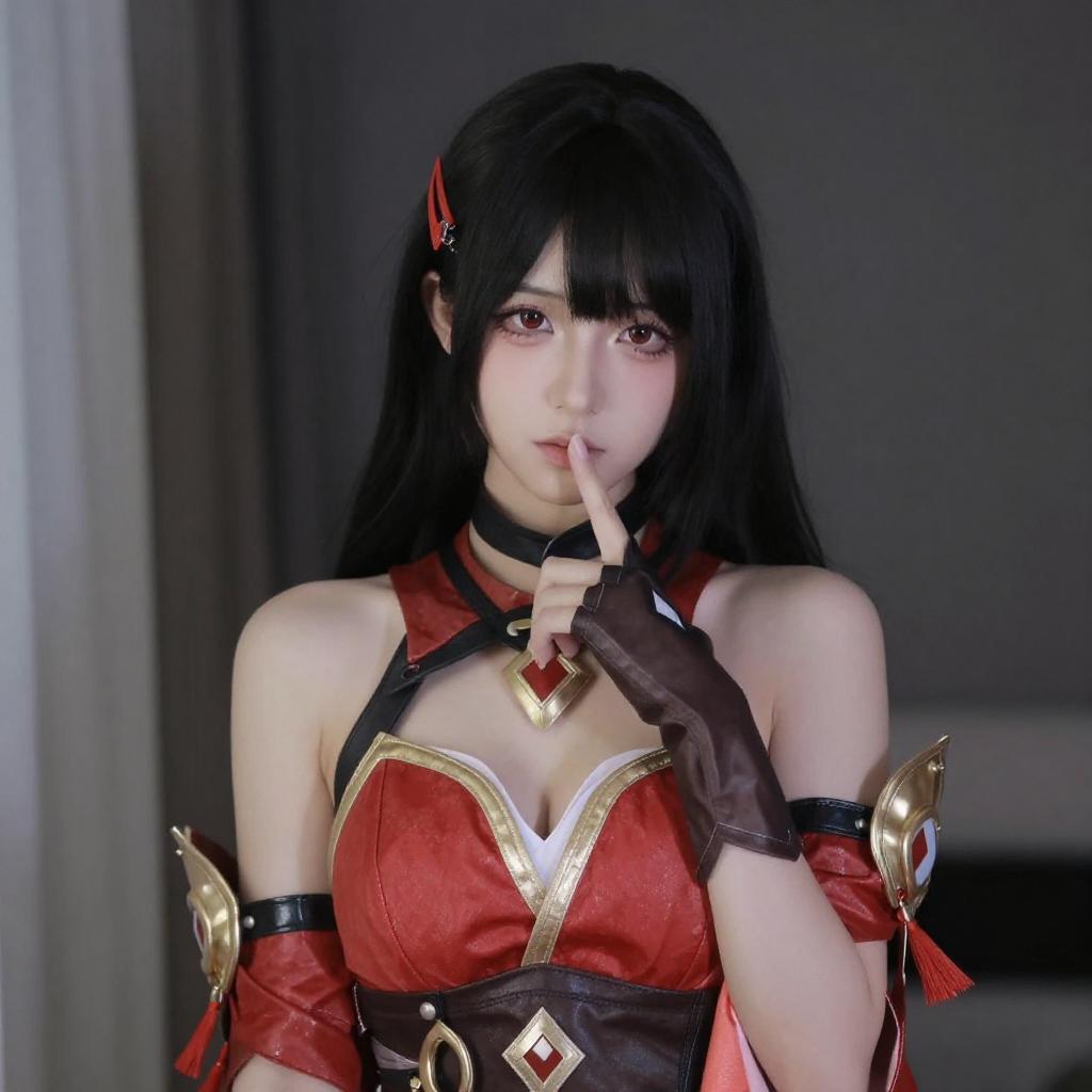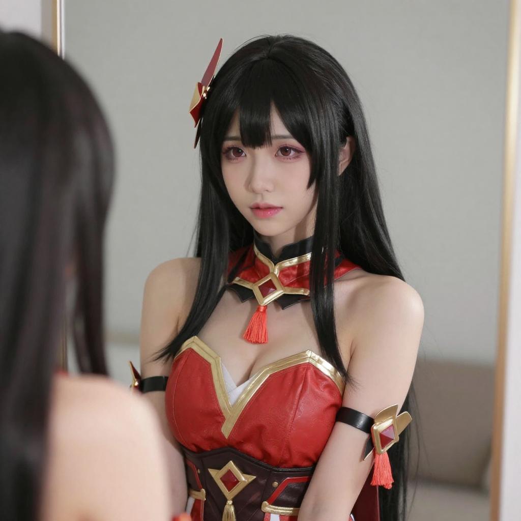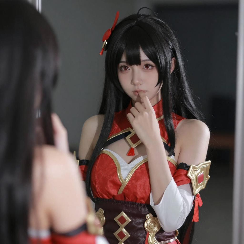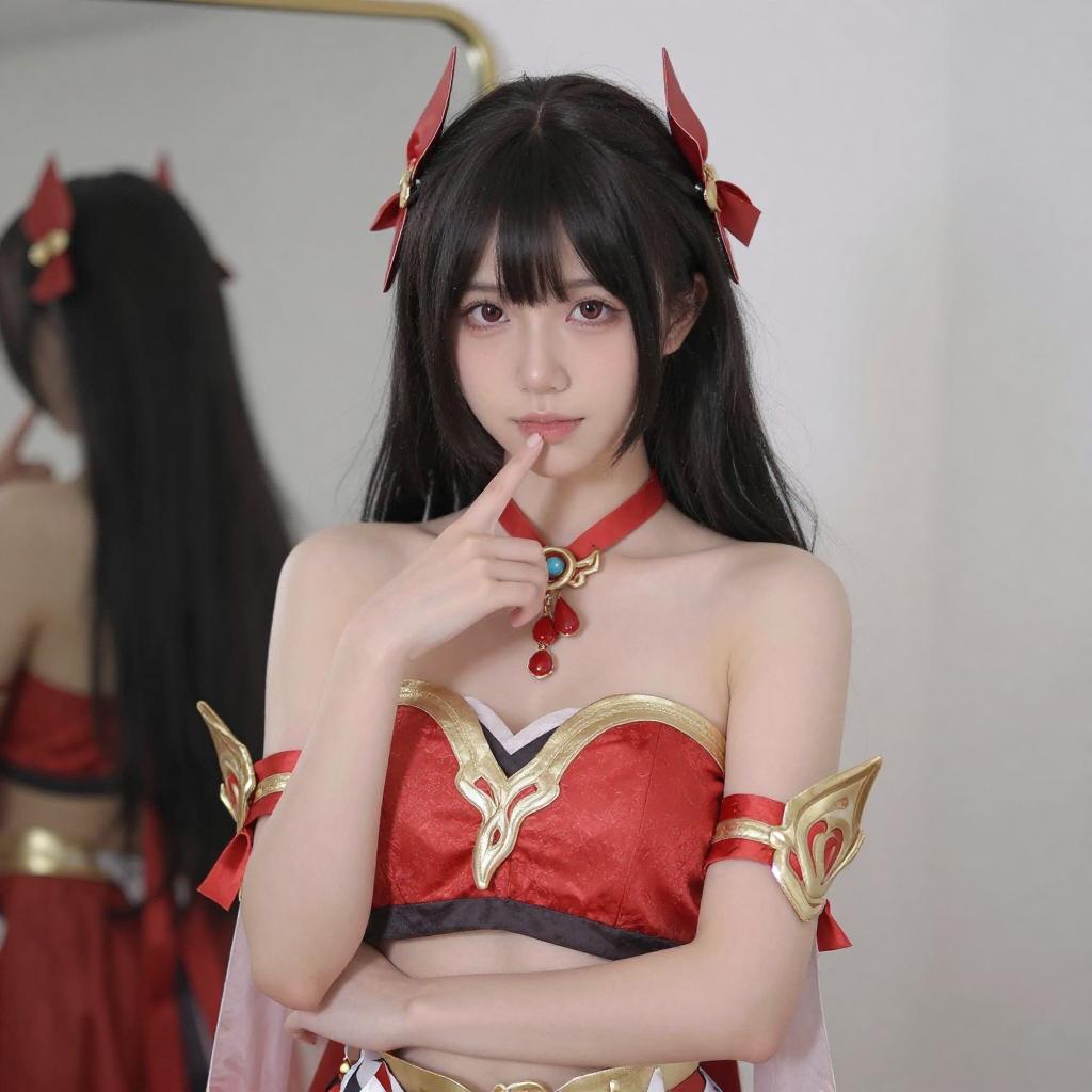 Photograph of an Asian woman with pale skin, black hair, and red hair clips, wearing a red and gold cosplay outfit with a revealing chest area, black choker, and finger to lips. She stands in front of a mirror, with a dark background and a partially visible curtain.
