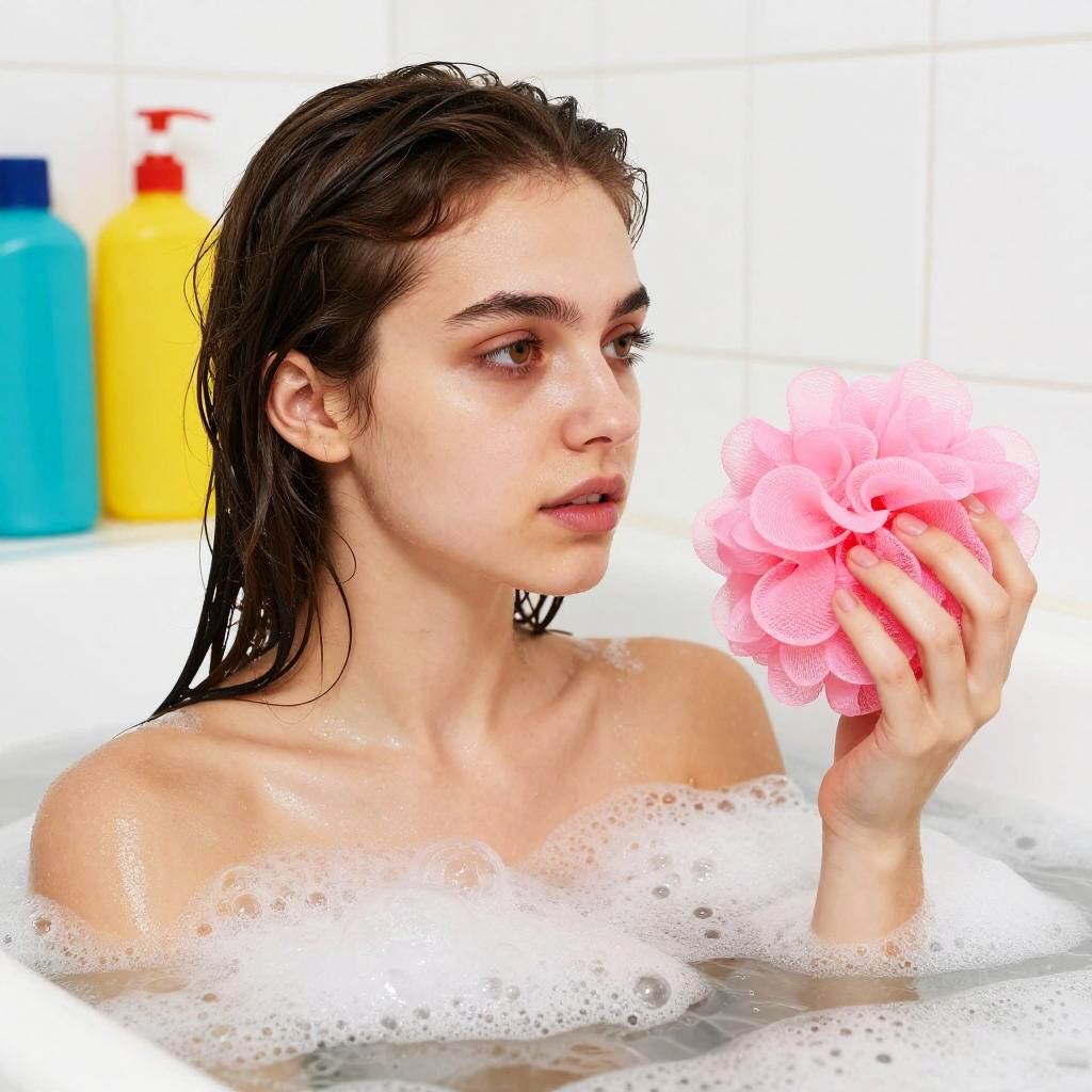 Photograph of a young woman with wet, dark brown hair, fair skin, and brown eyes, sitting in a white bathtub filled with soapy bubbles. She's looking to the right at a bright pink loofah sponge. The background features white tiled walls with colorful bottles. Her expression is neutral, and her shoulders are slightly visible above the bubbles. The image has a high-contrast, vivid color style.