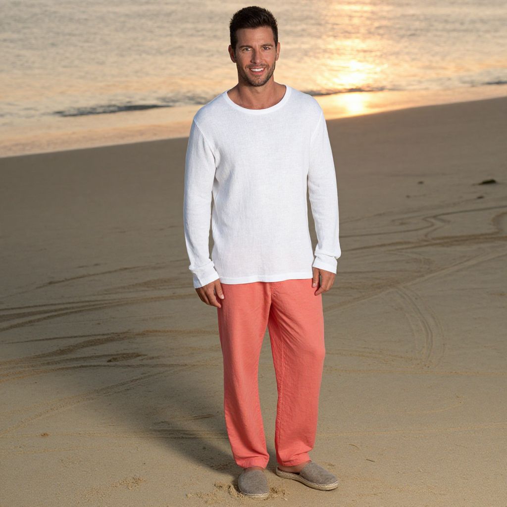 A man, linen blend pullover, soft white, loose silhouette, vibrant coral surf pants, comfortable espadrilles, beach-ready look, sandy banks, intricate channel patterns, golden sunset reflections, hand-tinted photograph, relaxed smile. Man has masculine face and piercing eyes