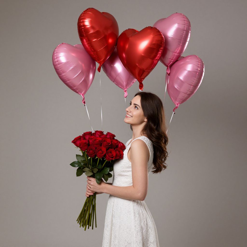 Smiling brunette woman in a white lace dress stands gracefully, holding a vibrant bouquet of deep red roses in her right hand while five heart-shaped balloons—two red and three pink—float gently above her head, creating a romantic and celebratory atmosphere.