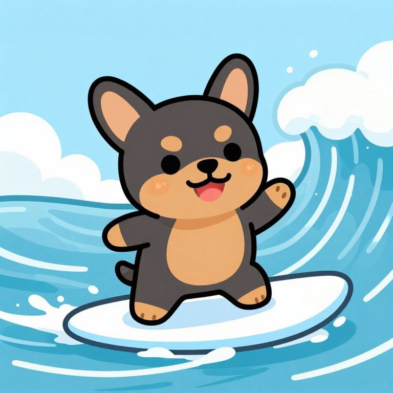 A cute chibi pinscher is joyfully surfing on a wave, depicted in a happy anime manga chibi style.