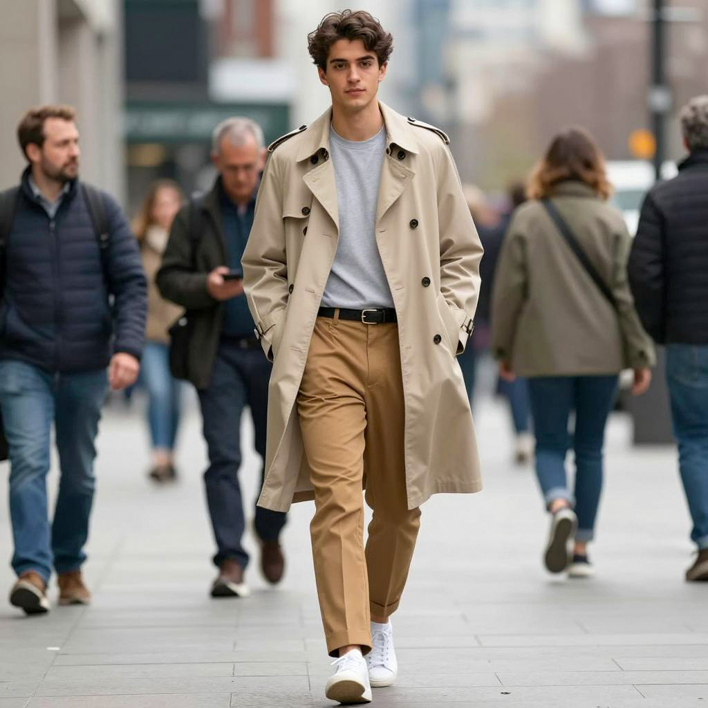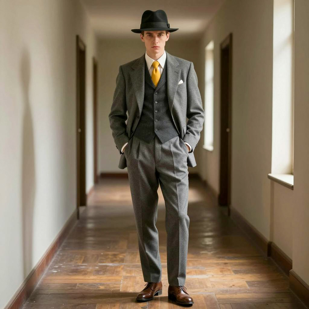 Morning coat suit costume, photorealistic, young man, standing in urban hallway, wearing tan coat, brown pants, brown shoes, straw hat, patterned shirt, hands in pockets, potted plant on left, wooden wall on right, natural light, modern style, mid-length coat, serious expression, full body shot, high contrast, subtle shadows