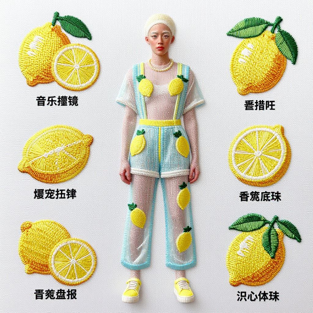 Embroidery Stitch Guide Taiwan albino model, wearing an intricate lemon outfit Tim Walker style, watery pastel colors, Lemons,
