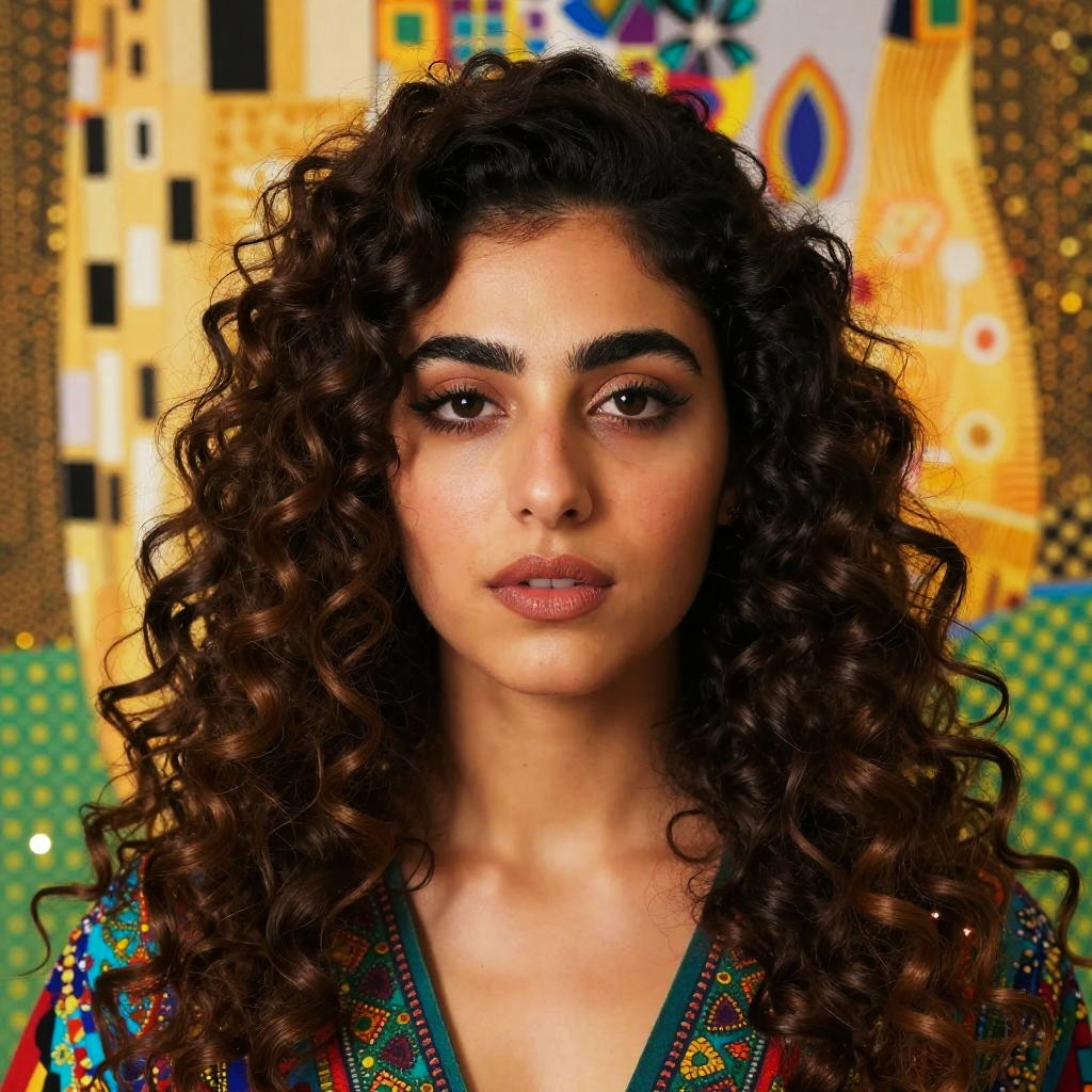 Realistic photo.Close-up of an enchanting Middle Eastern woman with voluminous curly hair, psychedelic 1960s background with dot matrix and paisley, halftones, in the style of Gustav Klimt realistic photo
