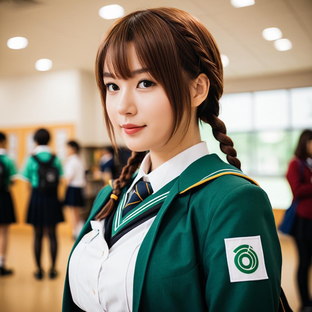 Photo-realistic cosplay photo of person in ai-chan (tawawa) costume. 1girl, green eyes, short hair, brown hair, side braid, large breasts, school uniformlifestyle stock photo, shallow depth of field, lifestyle stock photography, shallow depth of field, natural lighting, warm tones, soft background blur, candid moments, vibrant colors, realistic textures, modern casual clothing