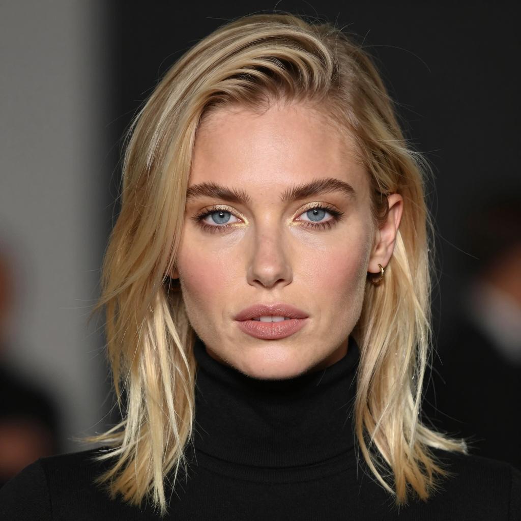 Ash blond hairstyle, photograph of a blonde woman with medium-length hair, blue eyes, wearing a black turtleneck, light makeup, slight pink lipstick, gold eyeliner, blurred dark background, close-up portrait, soft lighting, focused on face, modern fashion, subtle jewelry, realistic style