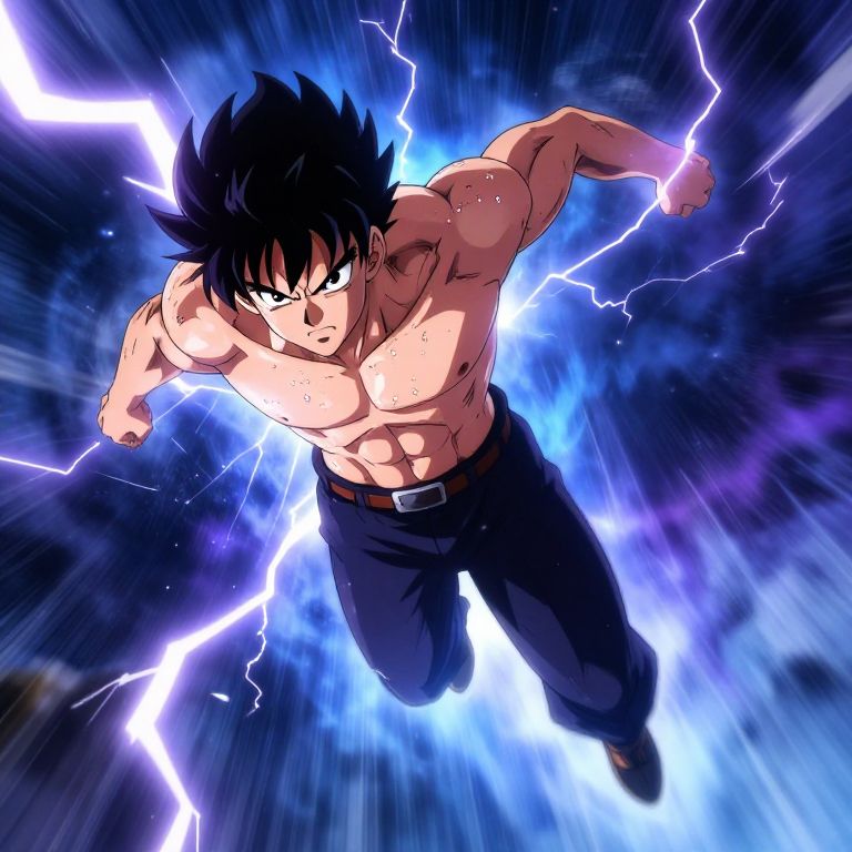 Buff anime guy flying through a stormy sky, lightning crackling around him, powerful and determined expression, highly detailed muscles with veins and sweat, anime style with energetic motion blur, vibrant blue and purple tones, epic fantasy vibe.