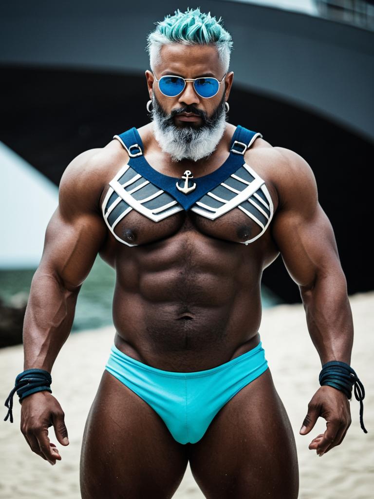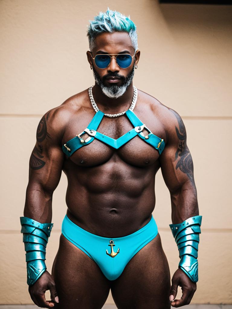 Photo-realistic image of a muscular dark-skinned mature male dressed in a bright blue Aegir cosplay costume. The man has short white hair with aqua streaks, a beard, blue-tinted sunglasses, and wears a harness, wrist guards, and briefs adorned with an anchor symbol. His tattoos, sharp fingernails, and strong physique with large pectorals and abs are clearly visible. The background is softly blurred, emphasizing the detailed textures and vibrant colors of the costume.