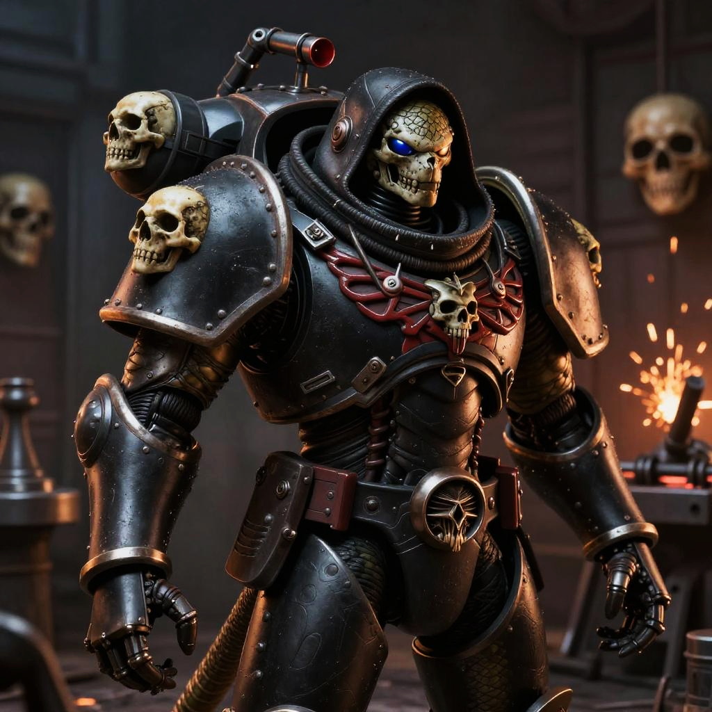 Snake in power armor-hoodie adeptus mechanicus, extremely detailed armor, looking away, eyepieces, encrusted with skulls, black and red, warhammer 40k, dark tones, blacksmith shop in the background, sparks, cinematic lighting, hyper realistic