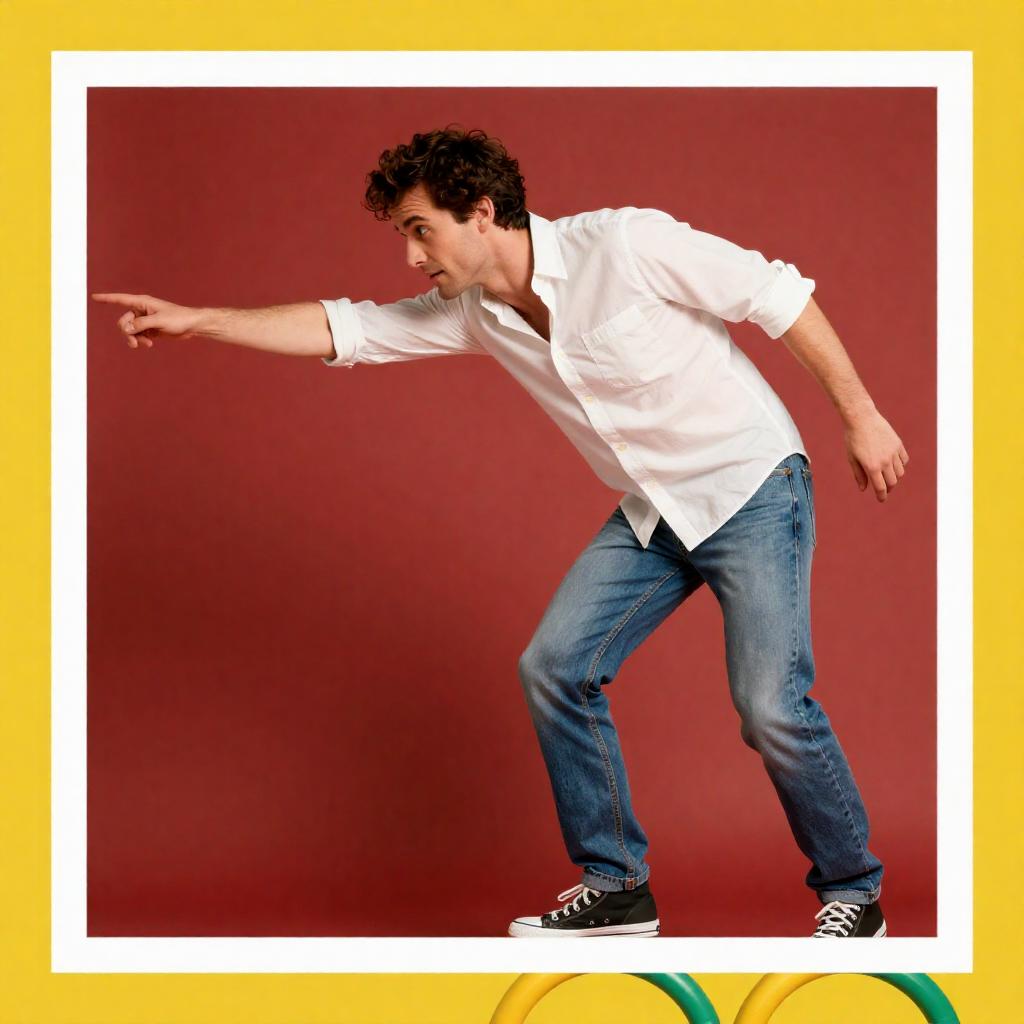 Photograph of John Simm, a white man with dark, curly hair, wearing a white shirt and blue jeans, leaning forward with his right arm extended. He is positioned in front of a red background with yellow and white borders. He is standing on top of two yellow and green rings. The image has a retro, vibrant color style.