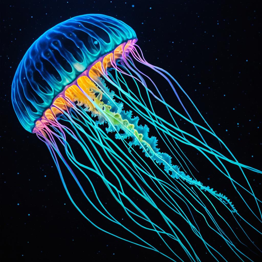 3D glass rendering of a bioluminescent jellyfish emerging from a glass tile pattern. The design includes ethereal blues and purples, with surreal lighting and abstract 3D elements creating a high-energy, dynamic composition.