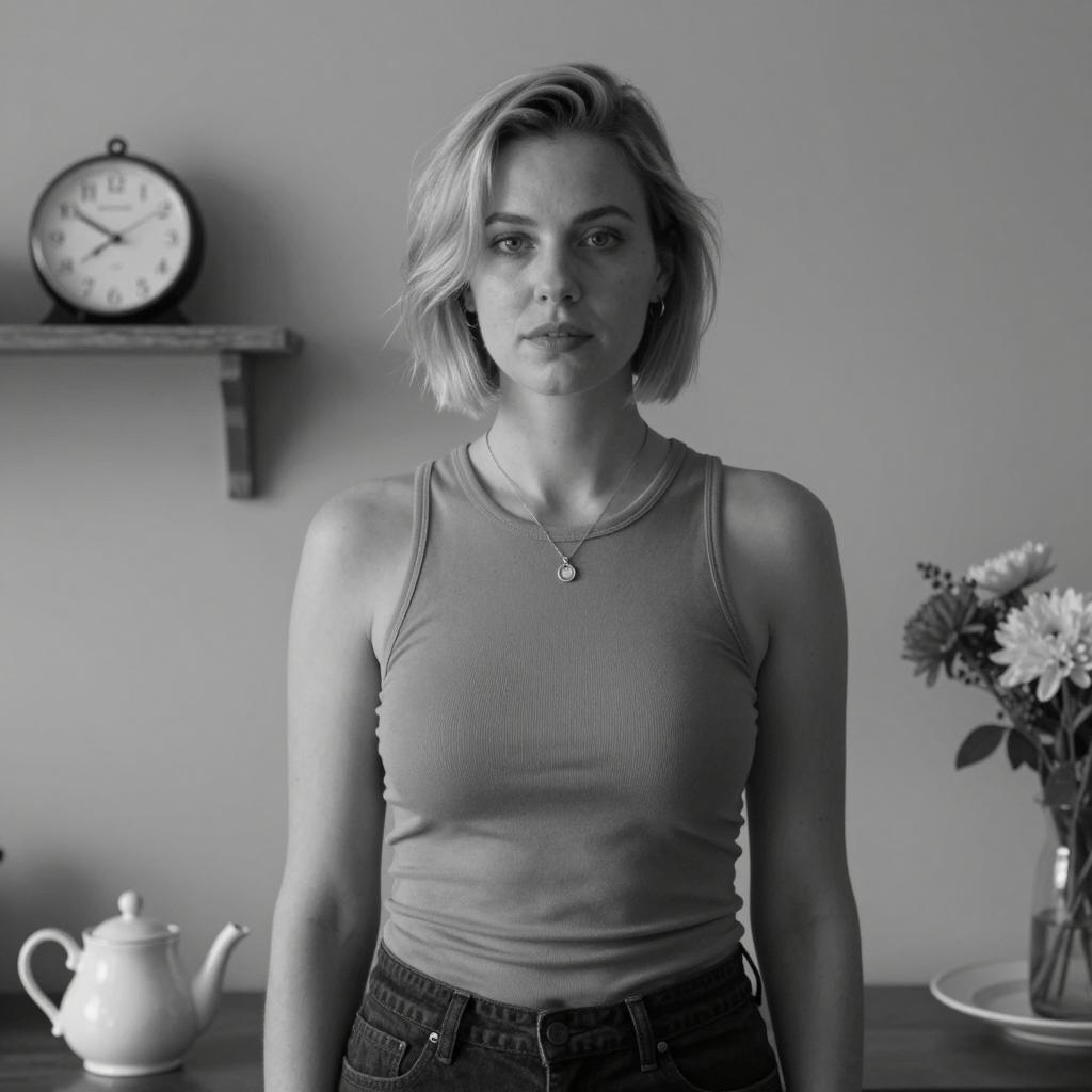 Black-and-white photograph of a woman with short blonde hair, wearing a sleeveless, form-fitting top with a round neckline, a small pendant necklace. She stands in a room with a clock on a shelf and a teapot on a table. Her expression is neutral. Right side of the image shows a partial view of a plate with flowers.