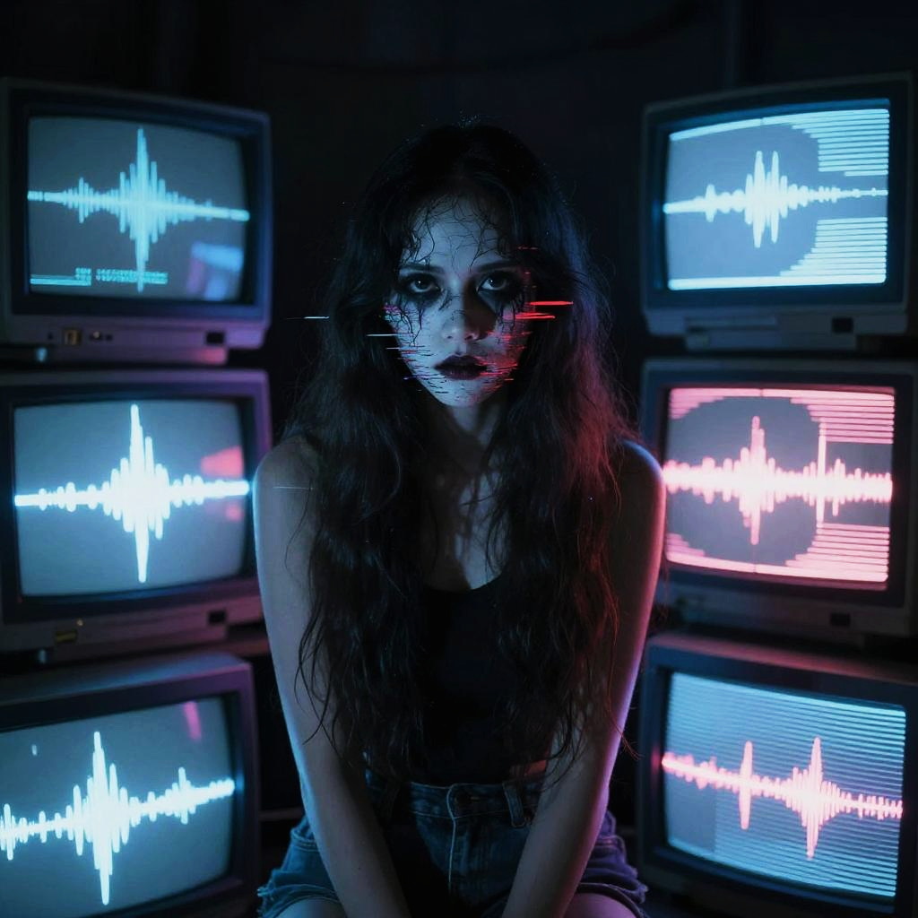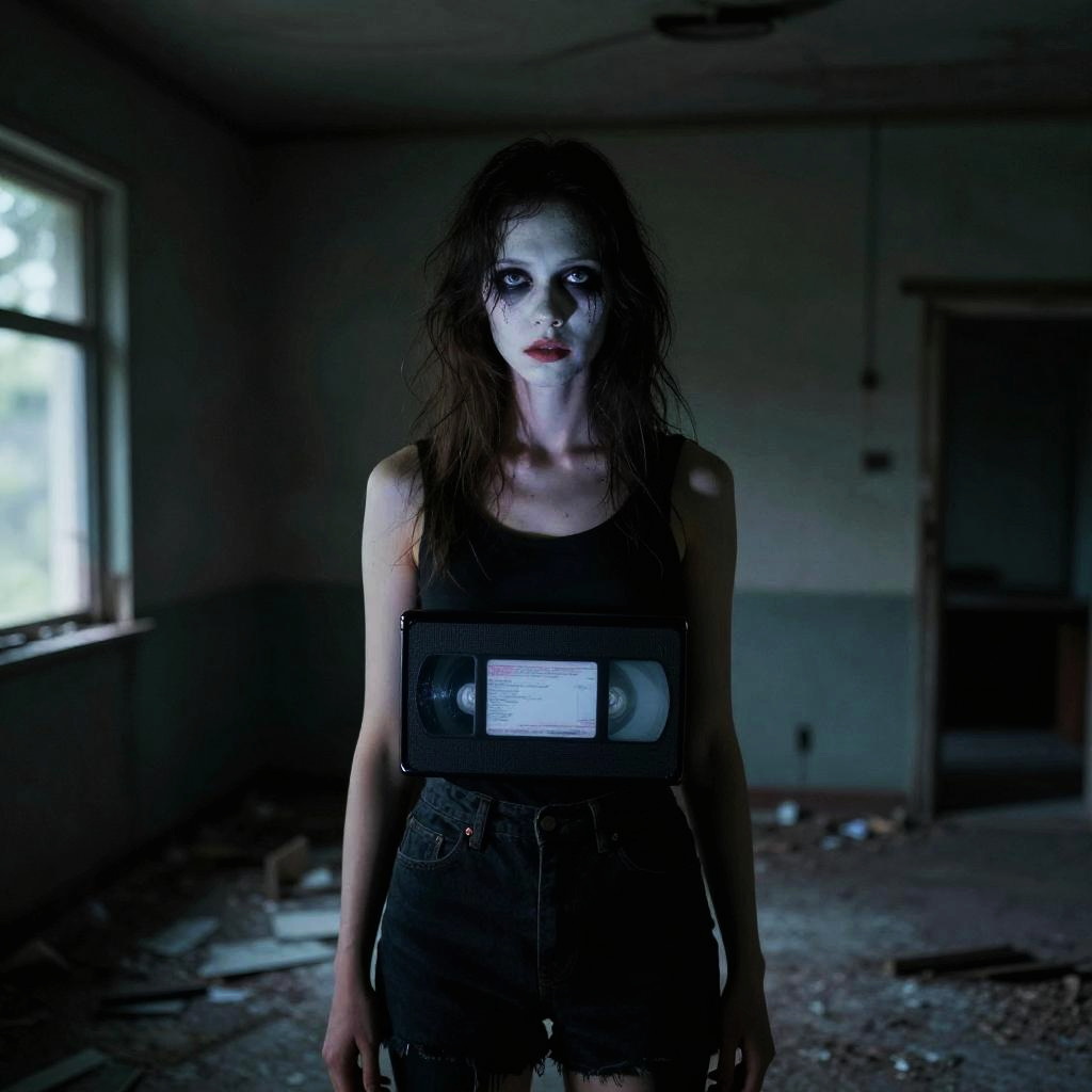 Analog horror girl standing in a dimly lit abandoned room, eerie static overlay, VHS tape distortions, pale skin with haunting eyes, vintage 80s horror vibe