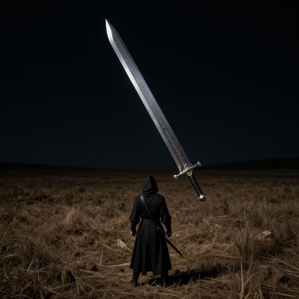 Photograph of a hooded figure in a dark cloak, holding a large, gleaming silver sword raised high, standing in a barren, grassy