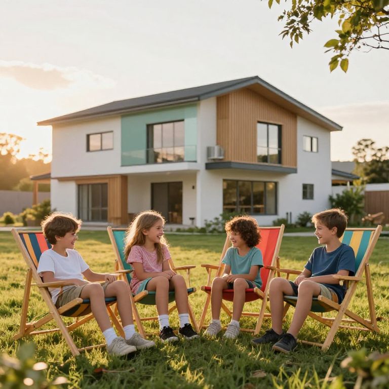 Architectural Drawing family of 5 with tweens sitting outside in lawn chairs, laughing, sunset, Sunny, happy, colorful, depth of field, portrait, 4k, Kodak Ektar 100, 105 mm f1. 8,