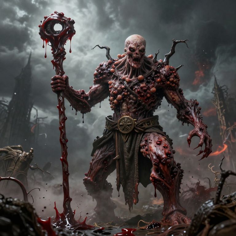 A towering Warhammer god of disease figure, covered in pustules and festering wounds, holding a staff dripping with toxic sludge, infecting the land with corruption, chaotic skies above, grimdark fantasy setting, rich textures emphasizing rot and contagion, atmospheric and menacing