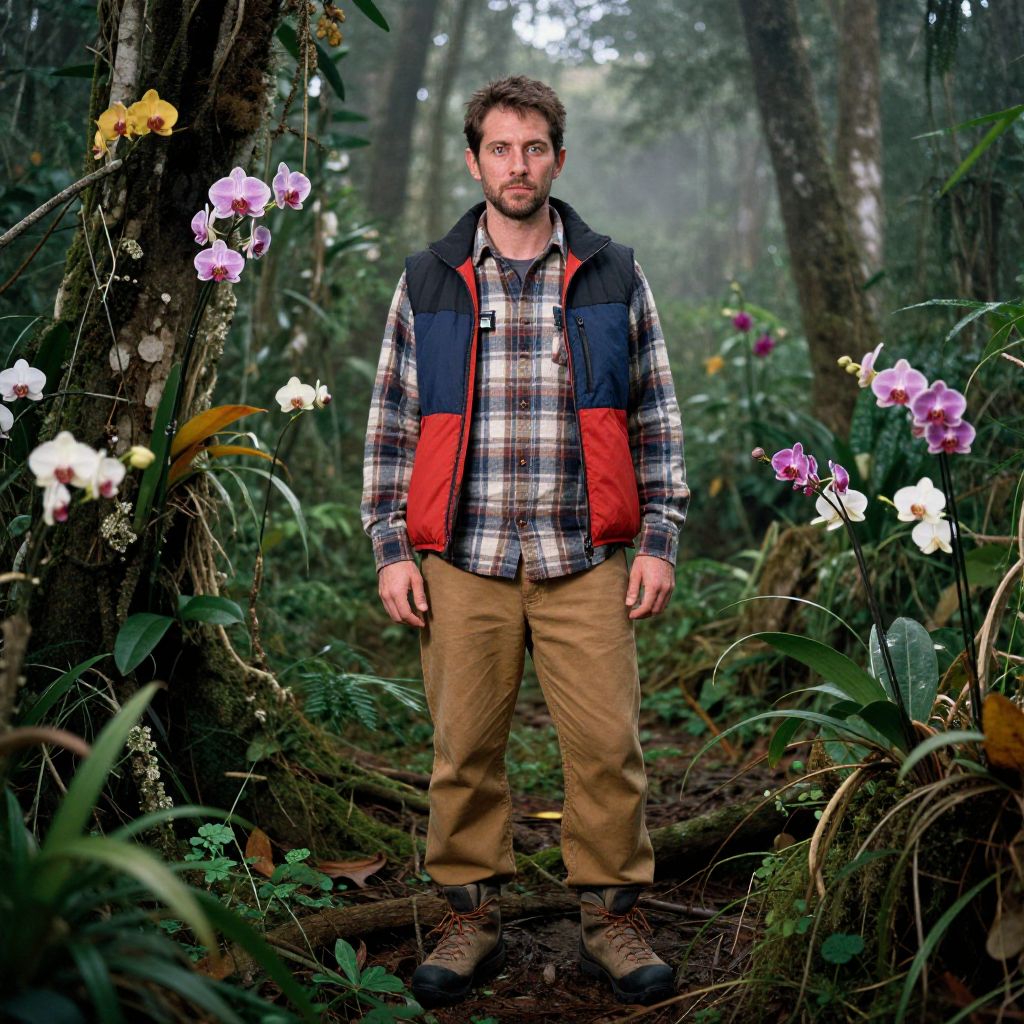 A man, long-sleeve plaid flannel shirt, rugged canvas pants, waterproof hiking boots, insulated vest, warm earth tones with pops of red, dense tropical rainforest, vibrant orchids blooming, mist rising from the forest floor, Holga camera style, contemplative expression. Man has masculine face and piercing eyes