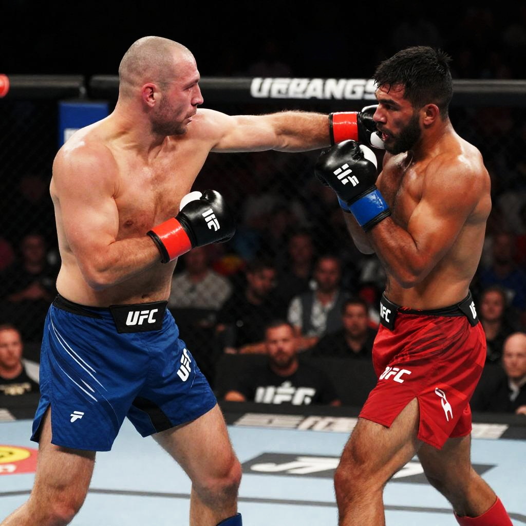 Two muscular men in UFC shorts, both shirtless, engaged in a boxing match. The man on the left, bald, punches the man on the right, who has dark hair, in the face. Right man's arm is raised to block. Audience in background.