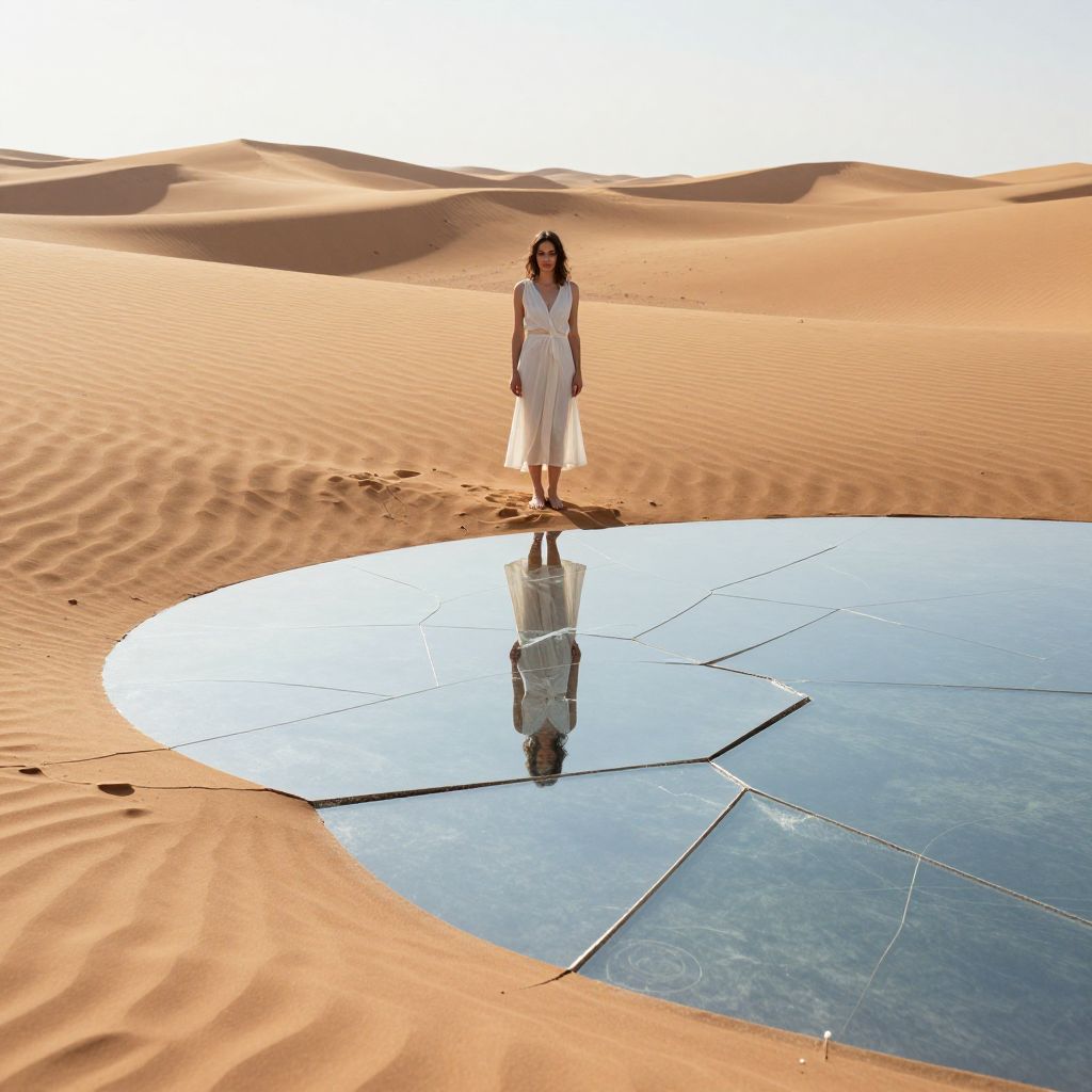 In a vast desert of rippling sand, a woman stands serenely beside a fractured pool of liquid mirror, her reflection fragmented yet perfectly clear, defying the harshness of the arid landscape.