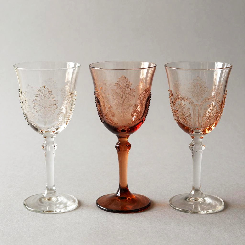 Three vintage wine glasses arranged side by side on a neutral background, detailed engraving style, intricate floral and ornamental patterns on glass surfaces, classic antique illustration with red-brown color, fine line art showing glass reflections and textures, soft shadow beneath glasses