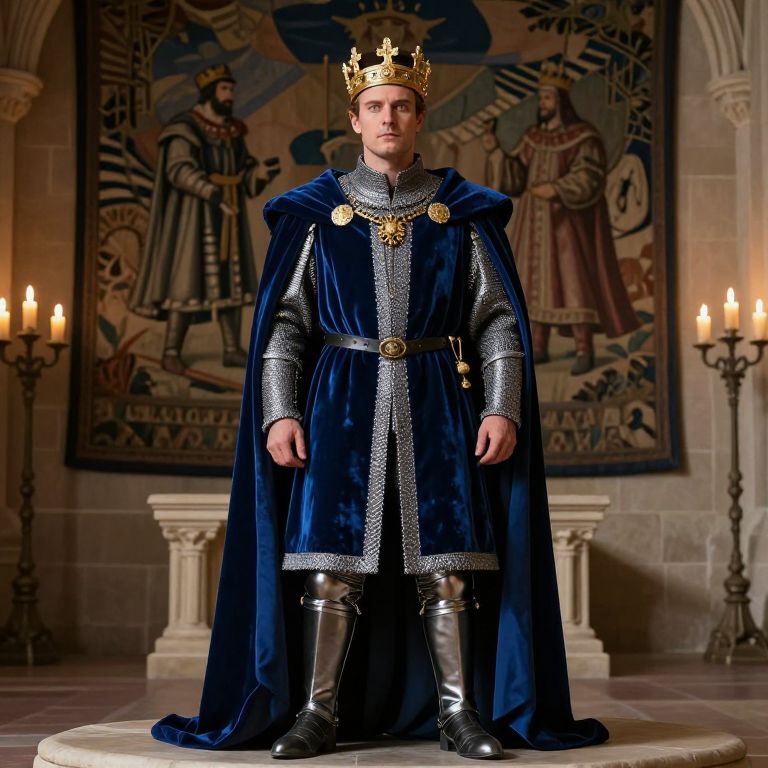 A majestic male king in full medieval royal attire, standing on a stone dais within a grand castle hall, dressed in a deep blue velvet doublet with silver chainmail armor, a royal cape flowing behind him, crowned with a large golden circlet, his broad face marked by a strong jawline and noble features, deep-set eyes with a regal expression, set in a dimly lit, candlelit chamber with tapestries depicting historic battles and royal ancestors.