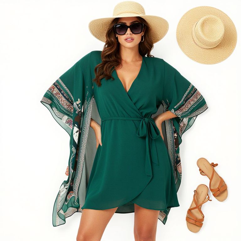 "Wrap mini dress, soft rayon, deep emerald green, short sleeves, tie waist, paired with lightweight kimono, printed chiffon, bohemian patterns, flowing sleeves, strappy sandals, leather, tan, flat sole, sun hat, straw, natural color, wide brim, oversized sunglasses, black, retro style.. Sexy. Pretty face and beаutiful eyes. Big breasts."
