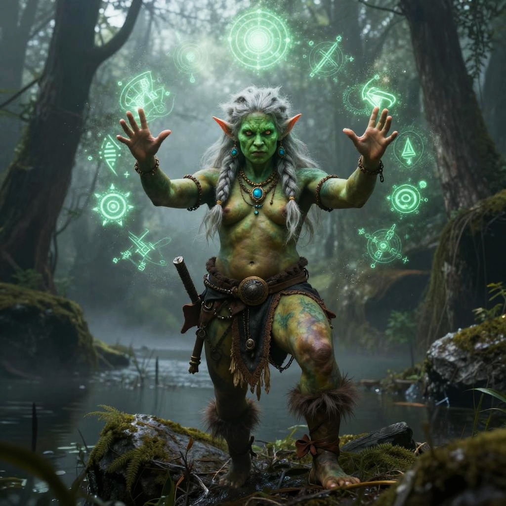 Photorealistic CGI image of a green-skinned, muscular female orc standing in a misty, dense forest. She has long, white, braided hair, pointed ears, and a fierce expression. Her topless upper body is adorned with tribal jewelry, and she wears a brown, tattered loincloth with a belt featuring a dagger. Her feet are bare, and she stands on a moss-covered log by a small, reflective pond. Green magical runes and symbols float above her raised hands, emitting a glowing light. The background is filled with tall trees and dense foliage, creating a dark, mystical atmosphere.
