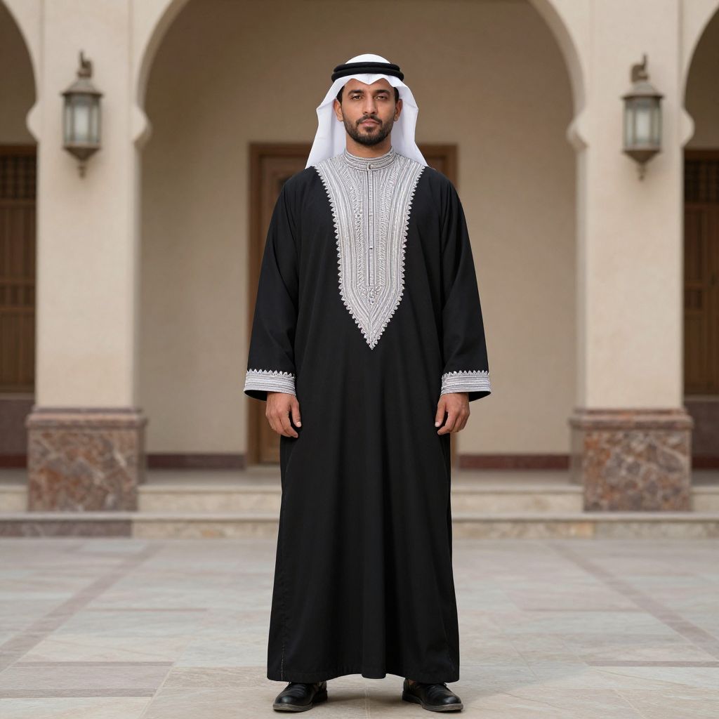 Photograph of a Middle Eastern man in a traditional black thobe with white embroidery, white headscarf, standing in a tiled courtyard with arched