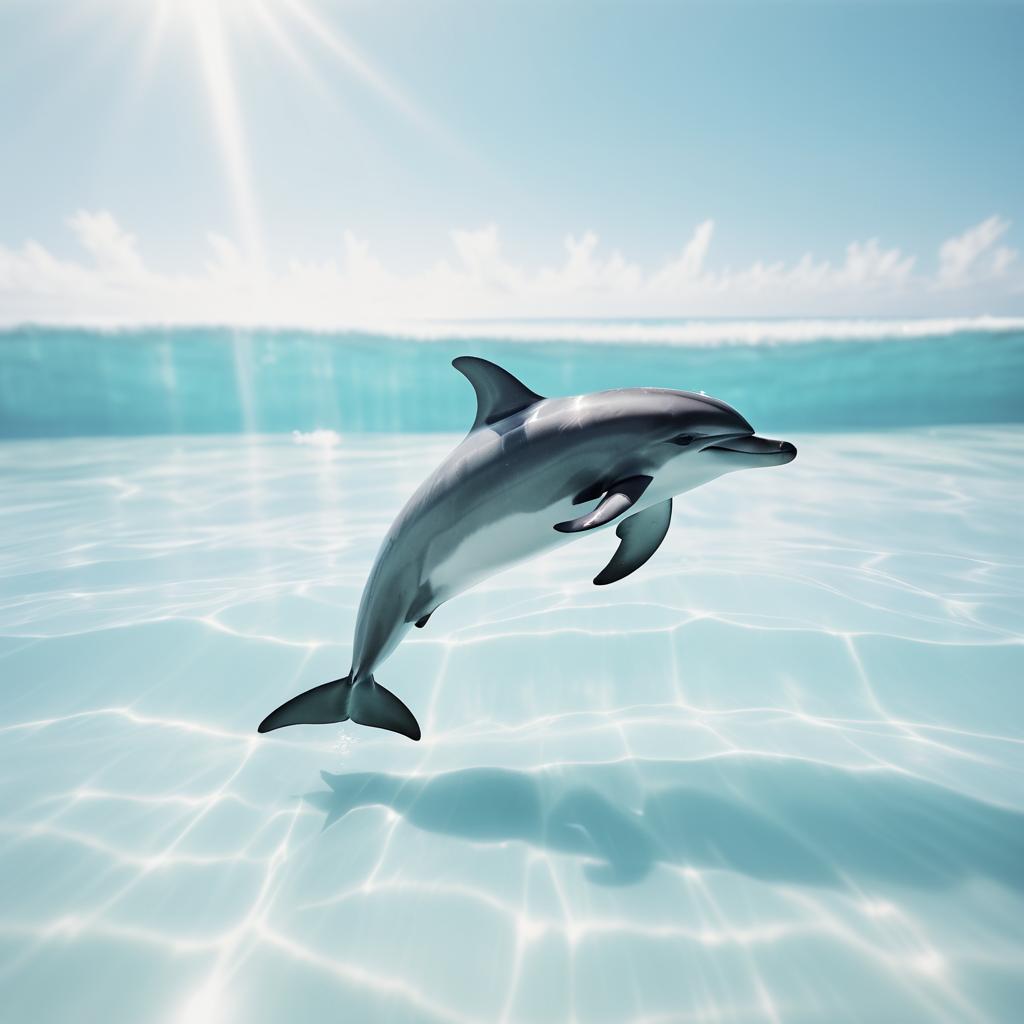 A photorealistic image of a sleek dolphin jumping out of the calm ocean waters, illuminated by bright sunlight and reflecting sparkles on the water surface, taken with a 35mm lens. The clear blue sky and gentle waves create a serene marine scene.