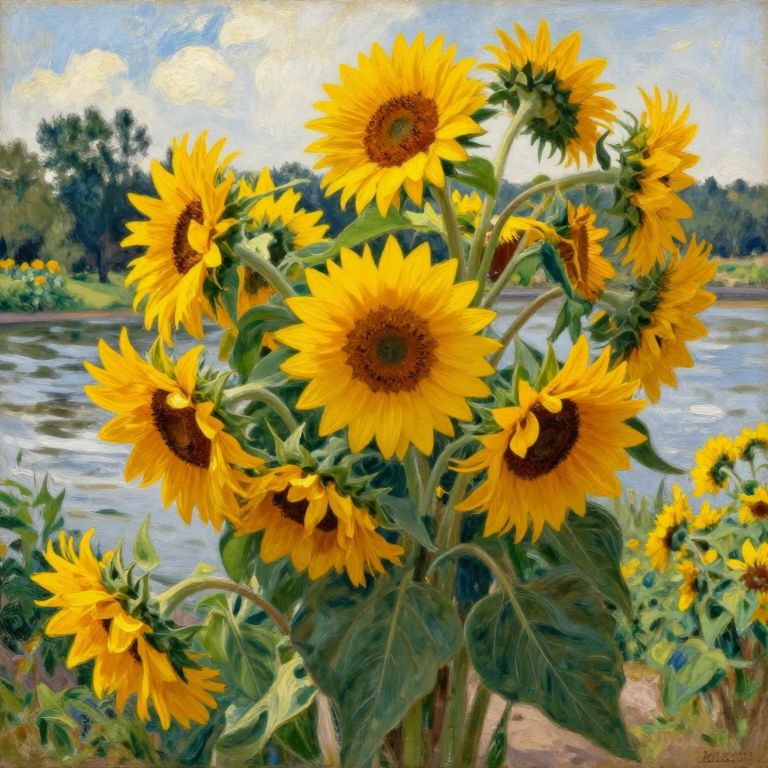 Impressionist-style painting of a sunlit field with vibrant yellow sunflowers, a calm river, and a partly cloudy sky, featuring a large tree