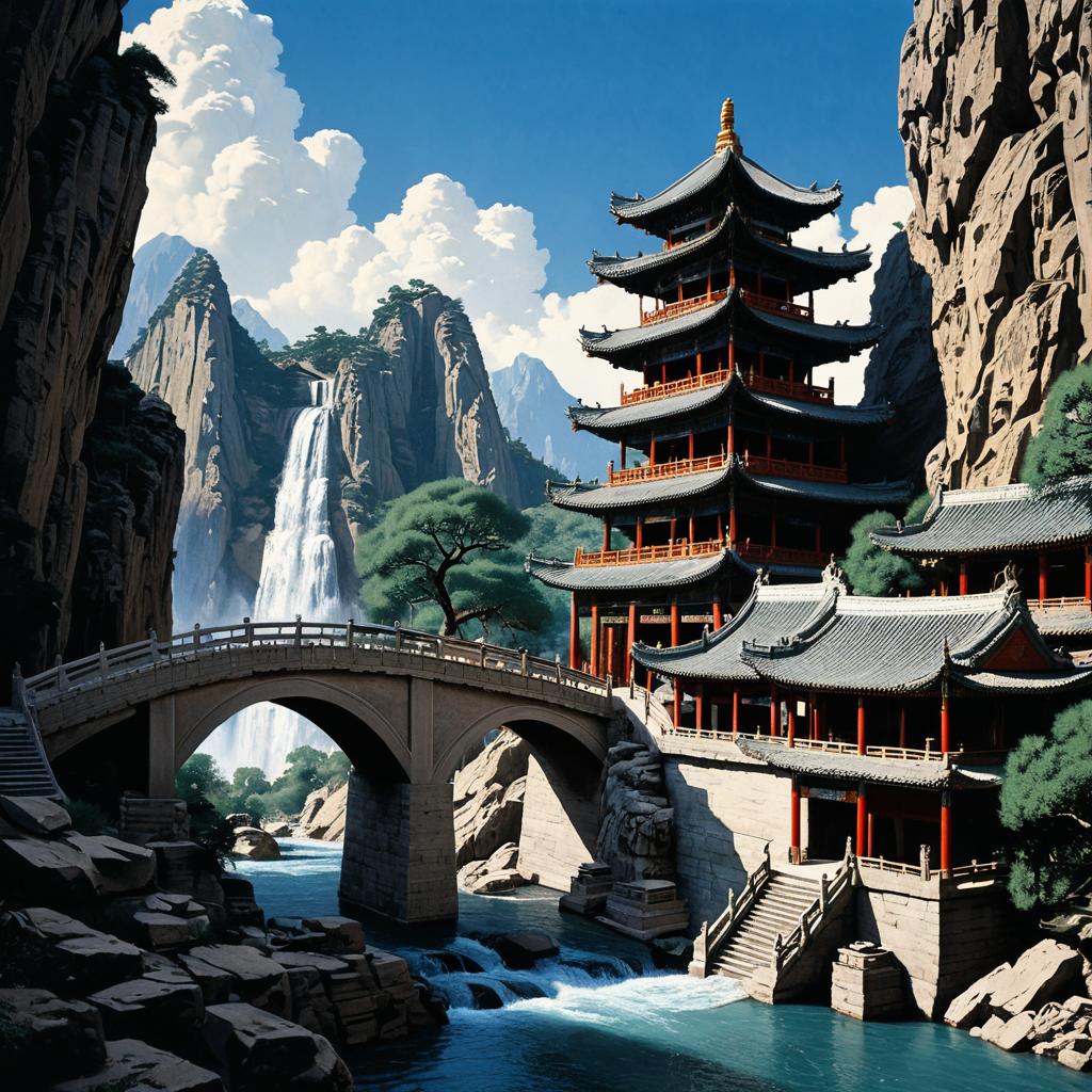 A gorgeous painting by maxfield parrish. chinese hanging temple. yungang buddh. the winding steps. stone bridge. clouds in the wind!! ultra clear detailed. 3 d, octane render. water fall farom the mountain.