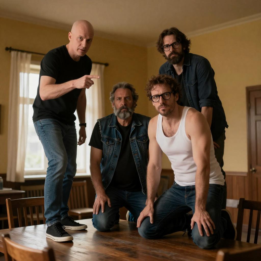 Photograph of a dimly lit, rustic room with wooden walls and ceiling. A bearded man in a brown leather jacket and blue jeans stands in the center, facing forward. Four people, partially shadowed, stand near bright windows in the background. A leather couch and wooden table with bottles are in the foreground.