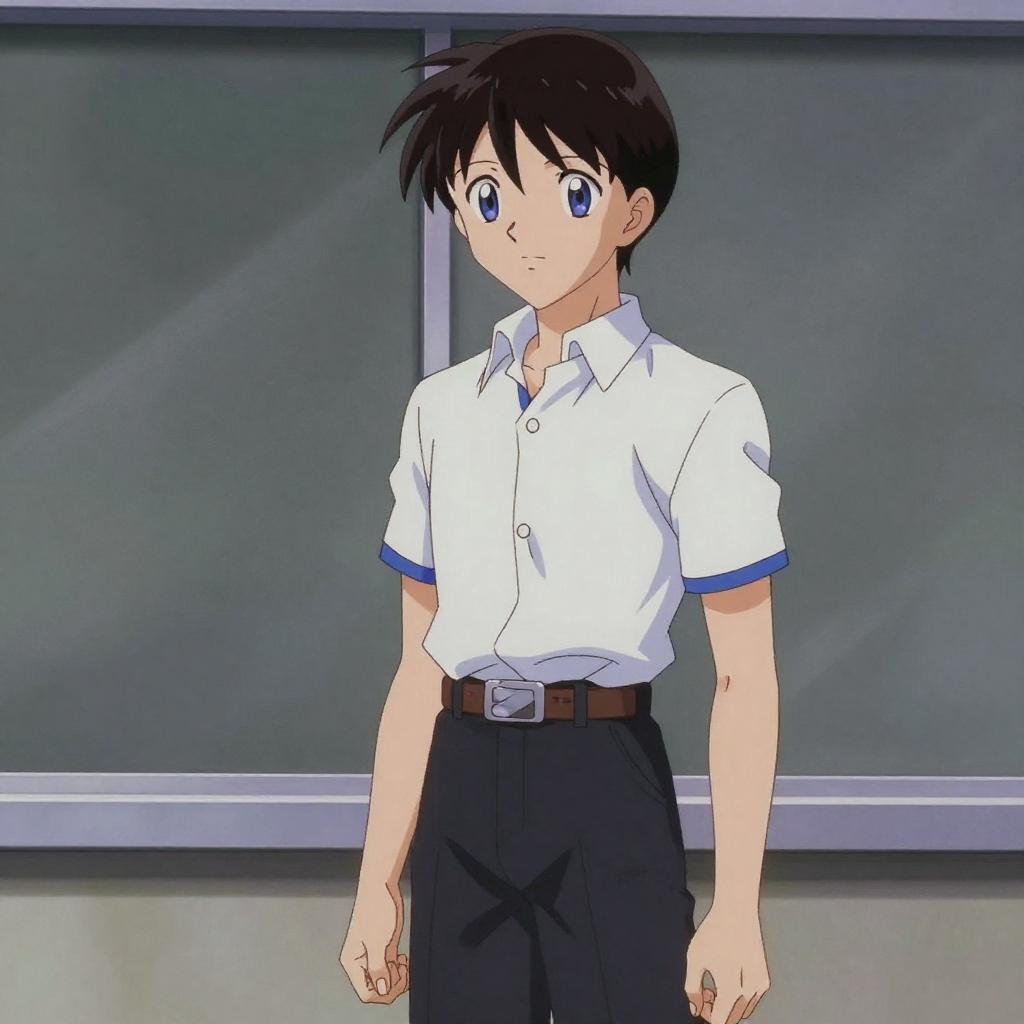 Evangelion anime style, anime screencap, 1990s_\(style\), ikari shinji, 1boy, belt, black pants, blue eyes, blue shirt, brown belt, brown hair, collared shirt, male focus, pants, school uniform, shirt, short bangs, short hair, short sleeves, solo, tokyo-3 middle school uniform, white shirt