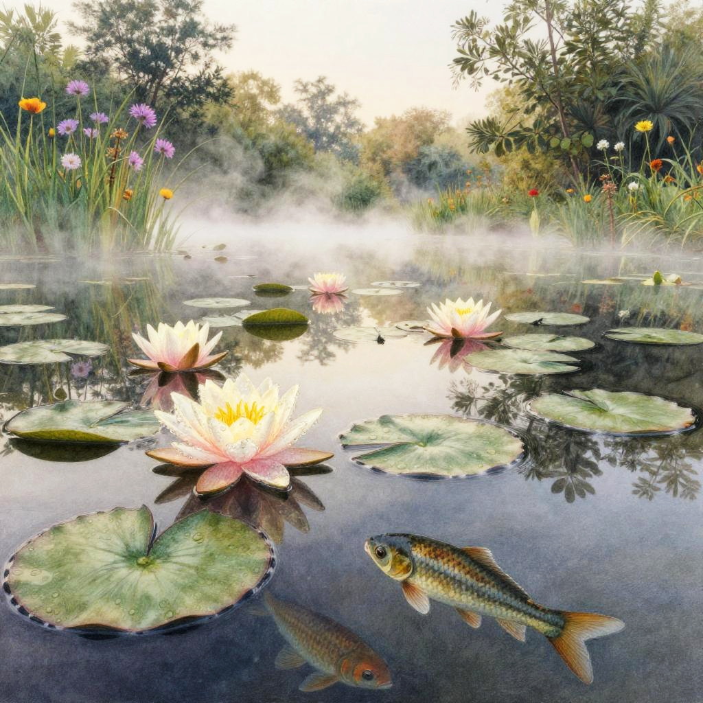 A hyper-realistic pond drawing at dawn featuring soft mist rising from the water, glowing lilies with dew drops, detailed fish beneath the surface, reflections of nearby wildflowers and trees, using a blend of pencil and watercolor techniques to create a lifelike and atmospheric nature scene.