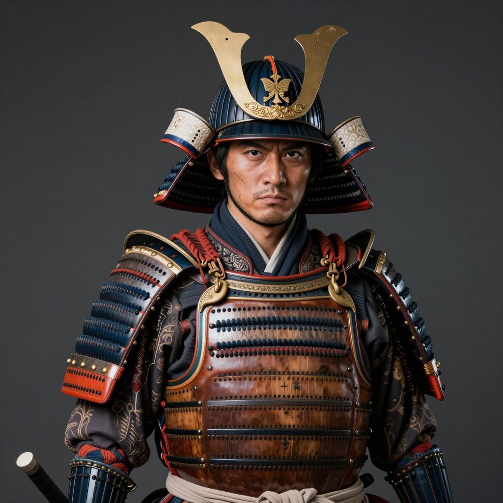 This striking portrait features a samurai warrior adorned in traditional armor, showcasing intricate details and a fierce expression. The artwork captures the essence of strength and honor, set against a subtle, dark background that enhances the vivid colors of the armor and helmet.