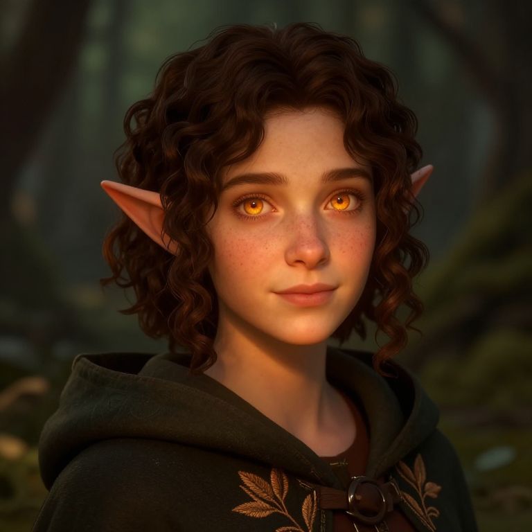A highly detailed CGI portrait of a young, androgynous elf with pale skin, golden amber eyes, and curly, dark brown hair. She has prominent, pointed ears and a gentle smile. She wears a dark, hooded cloak with leaf patterns. The background is a blurred, dark forest with soft, greenish light filtering through the trees. The image has a realistic, yet slightly fantastical style, emphasizing the elf's ethereal beauty and magical aura. The lighting highlights her face, creating a warm glow against the darker surroundings.