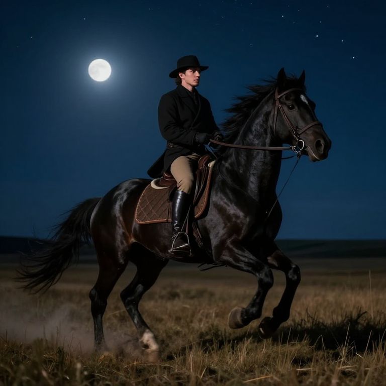 Photograph of a man riding a black horse under a night sky illuminated by a full moon. The rider, wearing a black hat, black jacket, beige riding pants, and black boots, sits confidently in the saddle. The horse's sleek, shiny coat contrasts with the dark blue sky and grassy field. The saddle has a brown, quilted design. The moonlight casts a bright, white glow on the scene, highlighting the rider and horse against the darker background. The horse's mane and tail are slightly windswept. Stars are faintly visible in the sky.