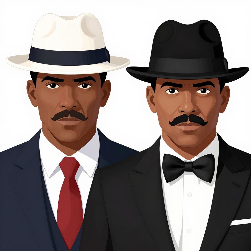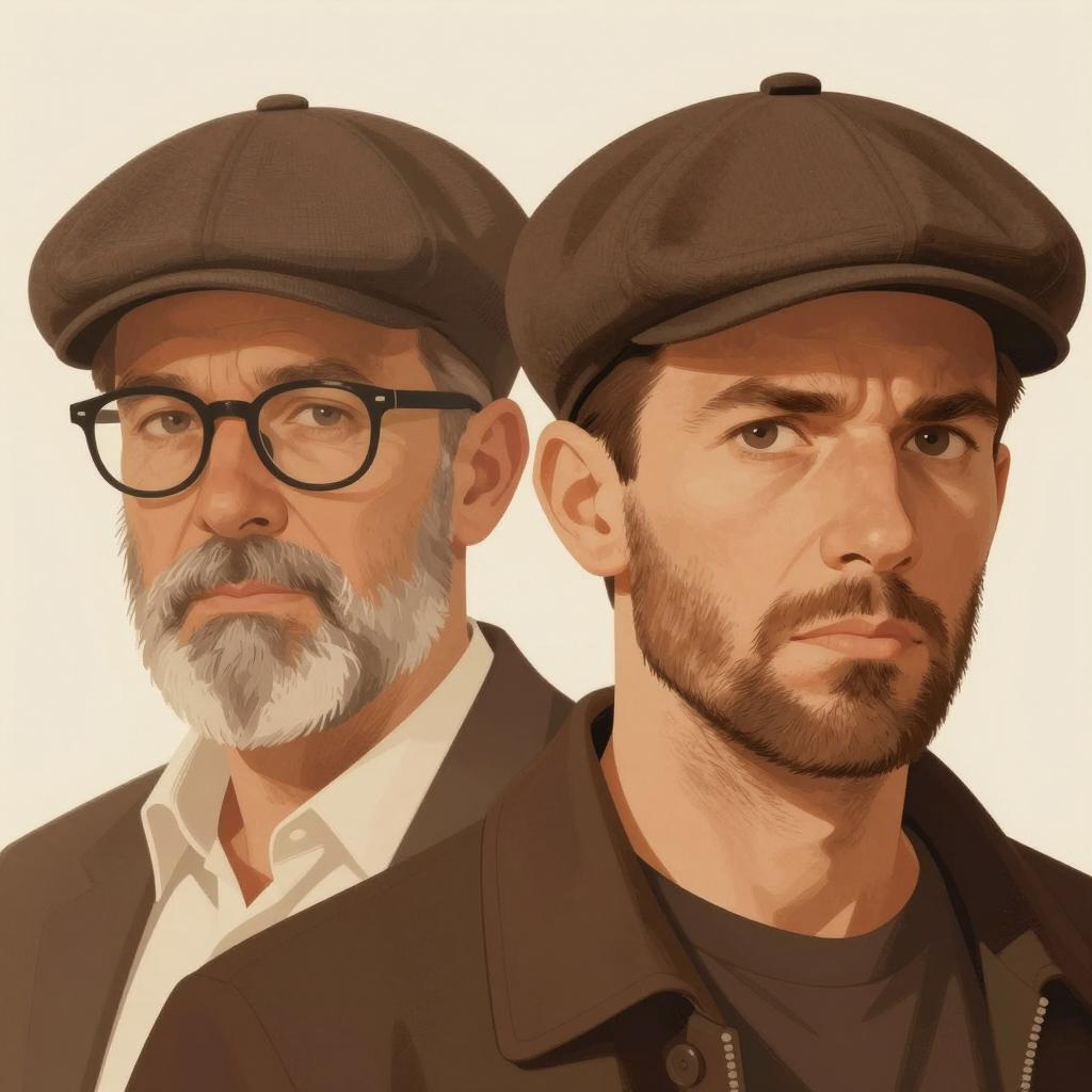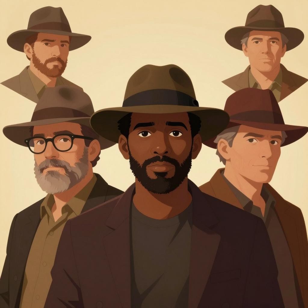 Illustration of three men in the foreground. Central man with dark skin, beard, and brown fedora. Man to left with glasses, gray beard, and brown hat. Man to right with gray hair, brown jacket, and red hat. Background has warm yellow light. Two smaller portraits of men with similar hats and expressions in top corners.