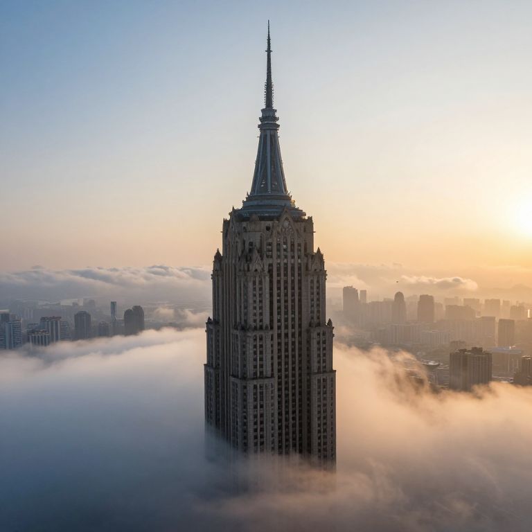 Photograph of the Empire State Building at sunrise, towering above a city partially shrouded in mist. The skyscraper's dark, classic Art Deco architecture is silhouetted against a gradient sky transitioning from soft blue to warm orange. Surrounding clouds hug the base, creating a mystical atmosphere. The sun is on the right, casting a gentle glow. Distant city buildings are faintly visible through the fog, adding depth to the urban landscape. The overall composition emphasizes the building's majestic height and the serene, early morning light.