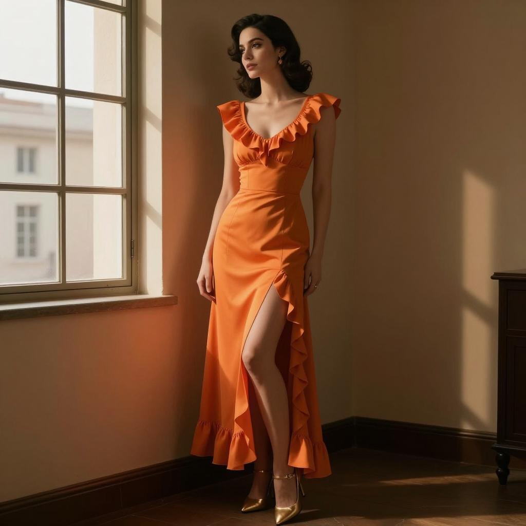 A woman standing indoors near a large window casting warm, dramatic shadows on the wall. She is wearing a vintage style orange evening gown with ruffle details and a high slit, paired with golden high-heeled shoes. The scene features cinematic lighting with warm tones of orange and brown casting soft shadows, creating a classic and elegant mood.
