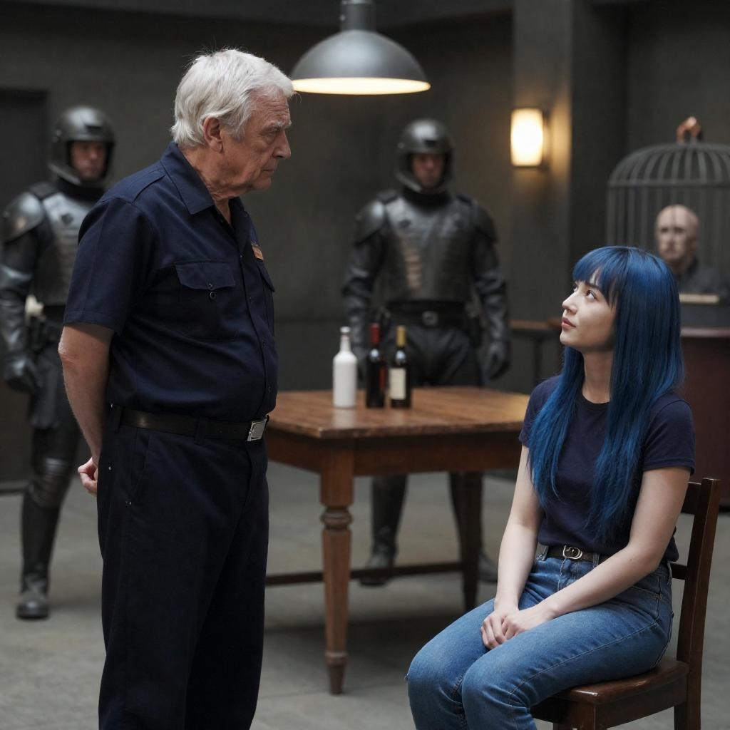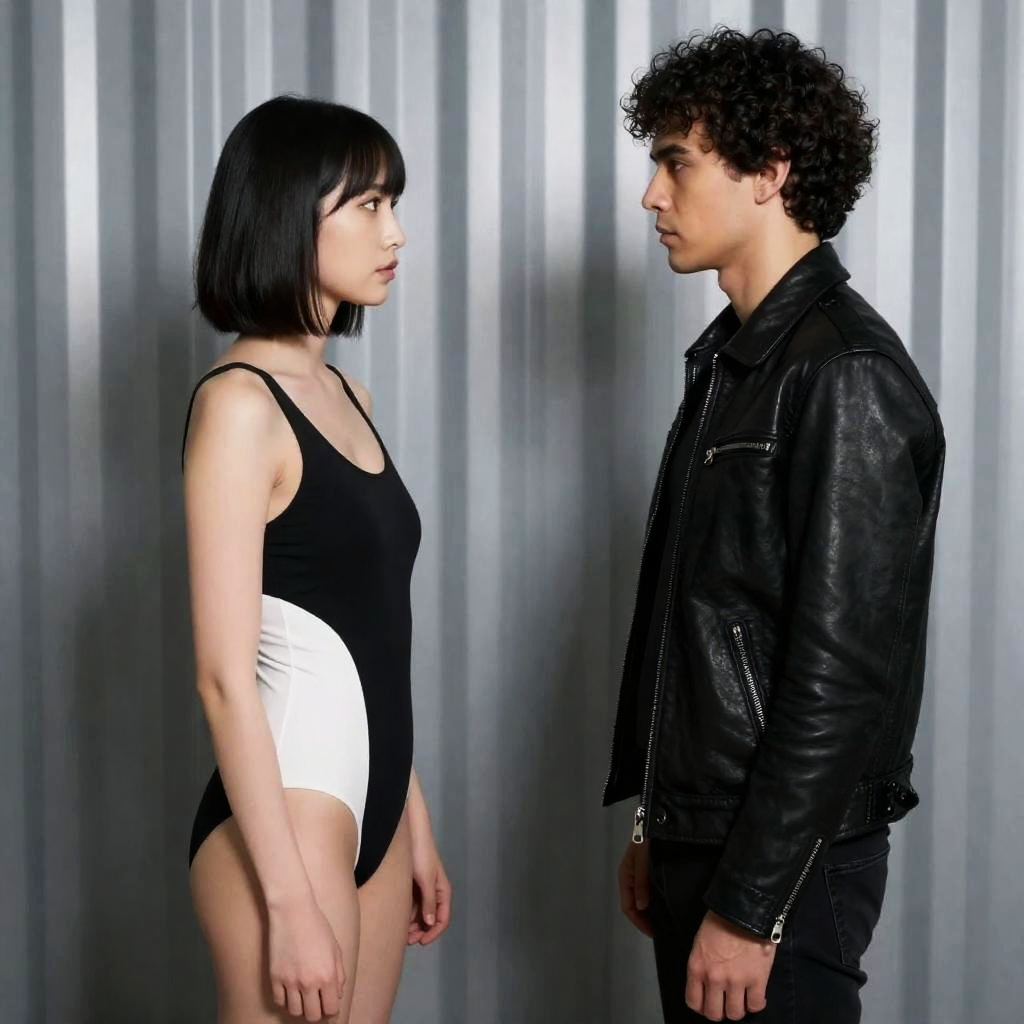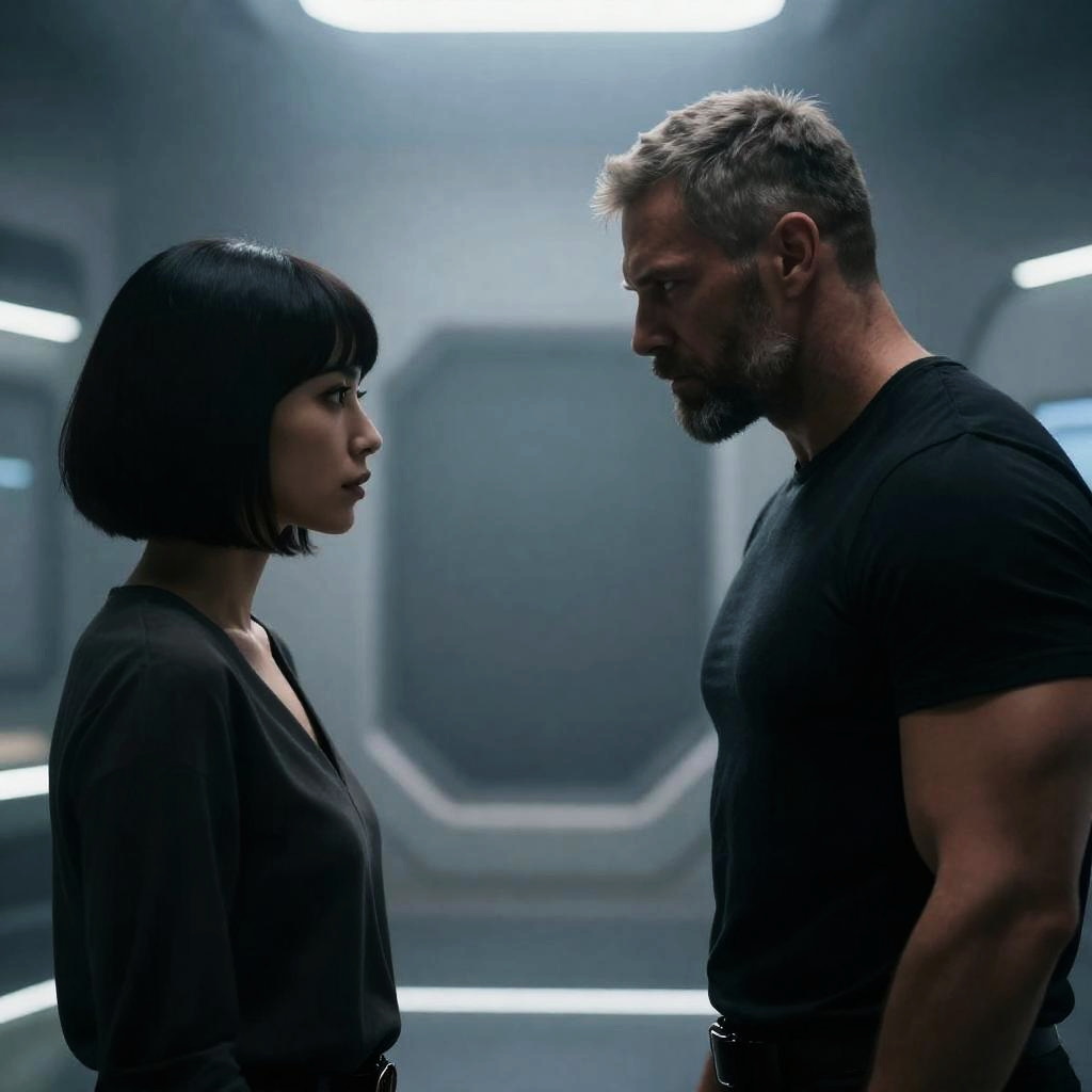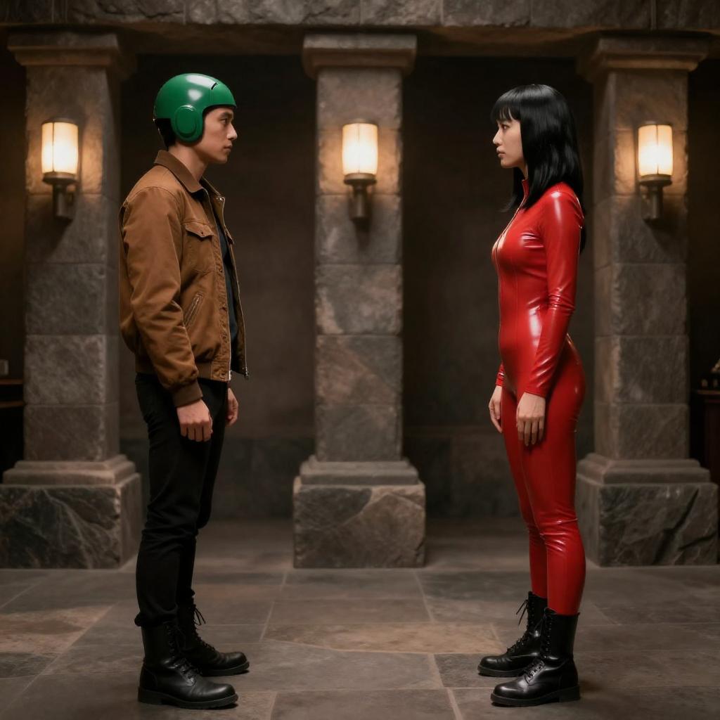 Two people in a dimly lit, stone-walled room. One with green headgear, brown jacket, black pants, and black boots stands left. The other, in red latex suit, black boots, and black hair, stands right. They face each other. Three stone pillars are between them. Bright lights in the background. Movieland.com .