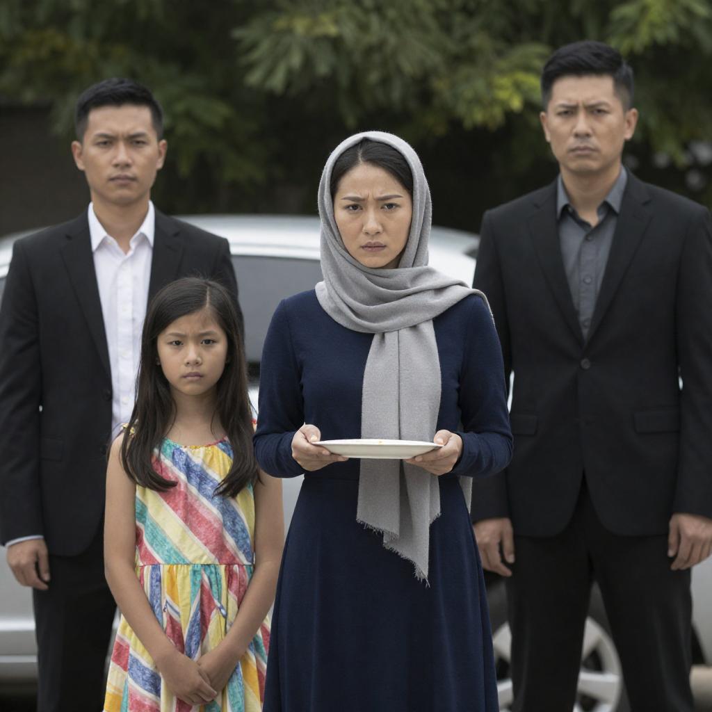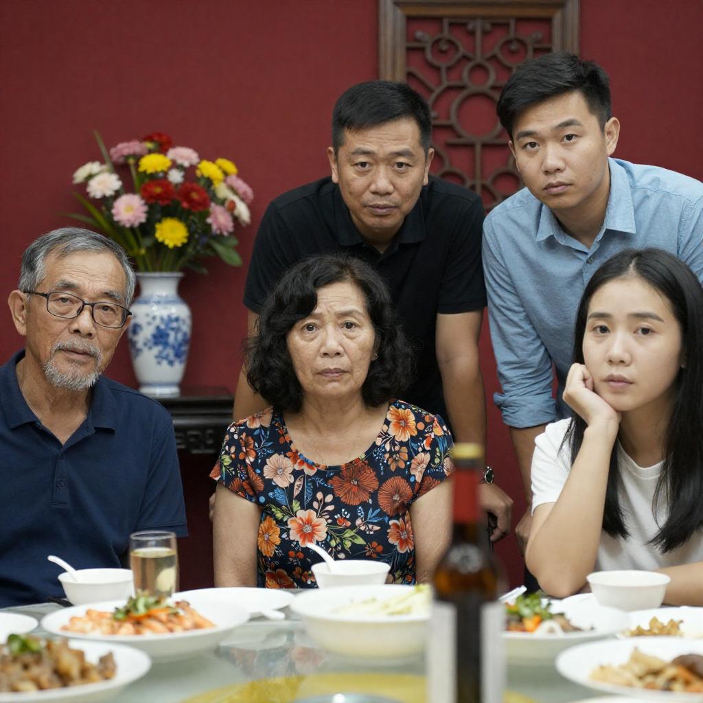 Photograph of five Asian people around a dining table. Elderly man with glasses and beard, middle-aged woman with black hair in floral dress, middle-aged man leaning forward in black shirt, young man in blue shirt, and young woman. Table with food, bottles, and dishes. Background with red wall, floral arrangement, and ornate wooden panel. Intense expressions on middle-aged woman and elderly man. Casual, indoor setting.