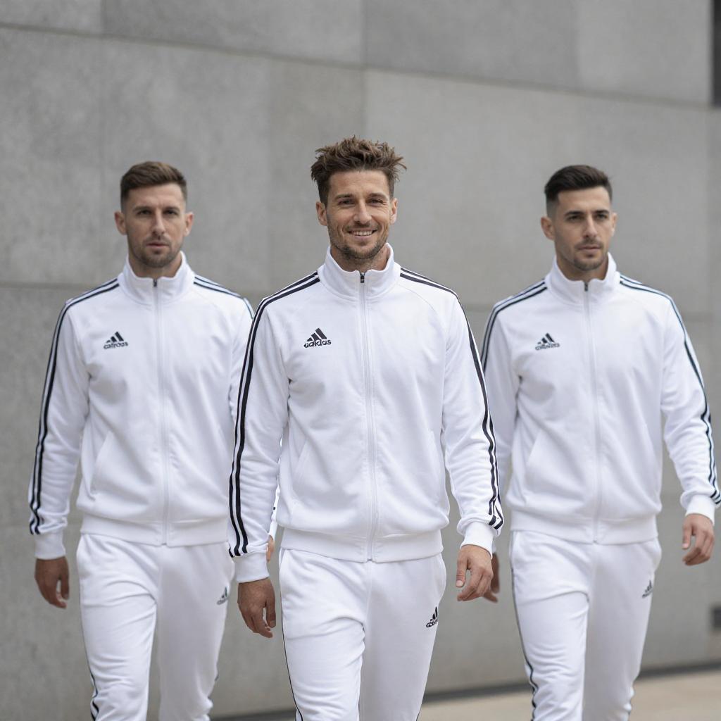 Synchronized Walk: White Tracksuit Trio