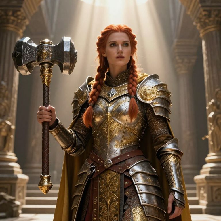 Digital artwork of a red-haired woman with braided hair, standing in a grand, sunlit ancient temple. She is clad in ornate, gold-accented medieval armor with intricate patterns, holding a massive, intricately designed hammer in her right hand. Her expression is determined, and she stands centered with columns and statues in the background. The light from above casts a divine glow on her, enhancing the heroic and mythological atmosphere. The armor features a mix of metallic textures and detailed engravings, adding to the regal and powerful appearance.
