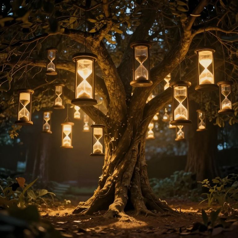 An ethereal tree of time, adorned with luminous hourglasses that cradle frozen memories, whispers the weight of lost moments while casting a warm, golden glow that illuminates the path of remembrance.