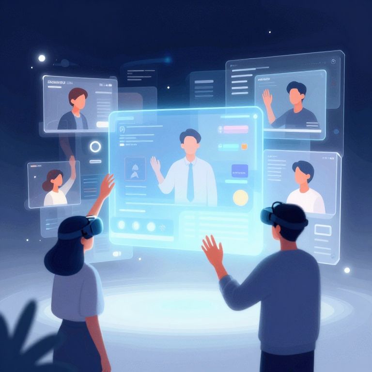 Digital illustration of two people in VR headsets interacting with holographic interface displaying multiple transparent, glowing screens with virtual avatars.