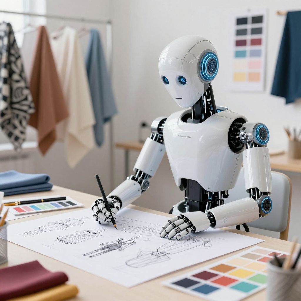 Free AI clothing generator visualized as an intelligent fashion designer robot sketching innovative apparel designs on a digital canvas, surrounded by fabrics, color swatches, and pattern samples in a bright creative studio space.