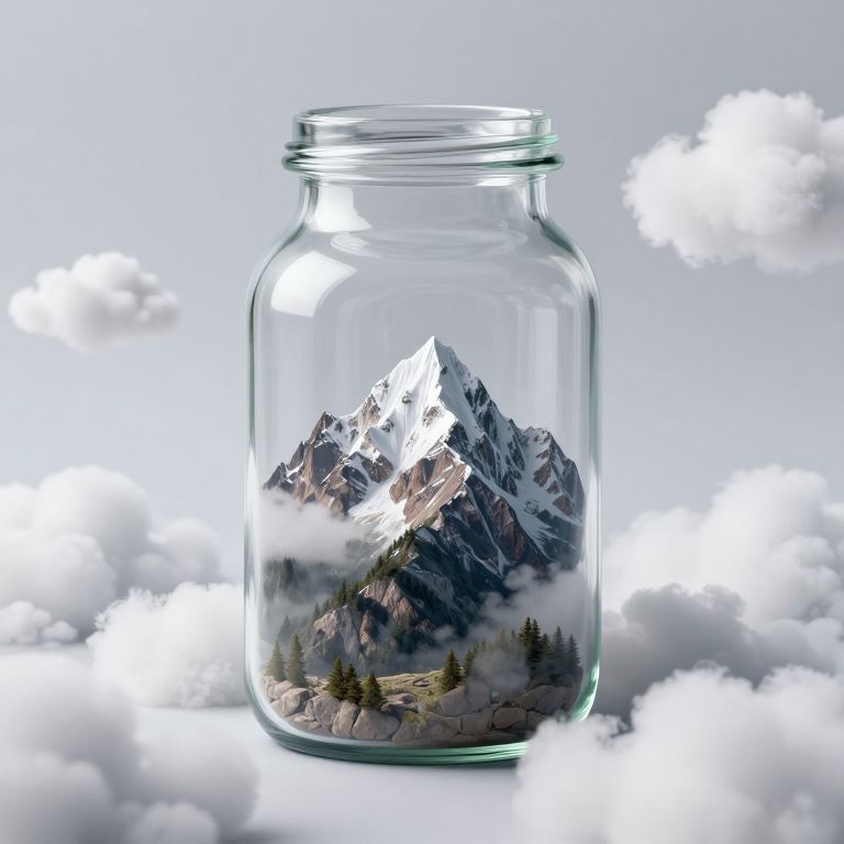 A surreal 3D-rendered scene depicts a miniature mountain range encased in a transparent glass jar, surrounded by fluffy white clouds, evoking the whimsical concept of capturing landscapes as one might collect clouds in a bottle, blending realism with imaginative artistic vision.