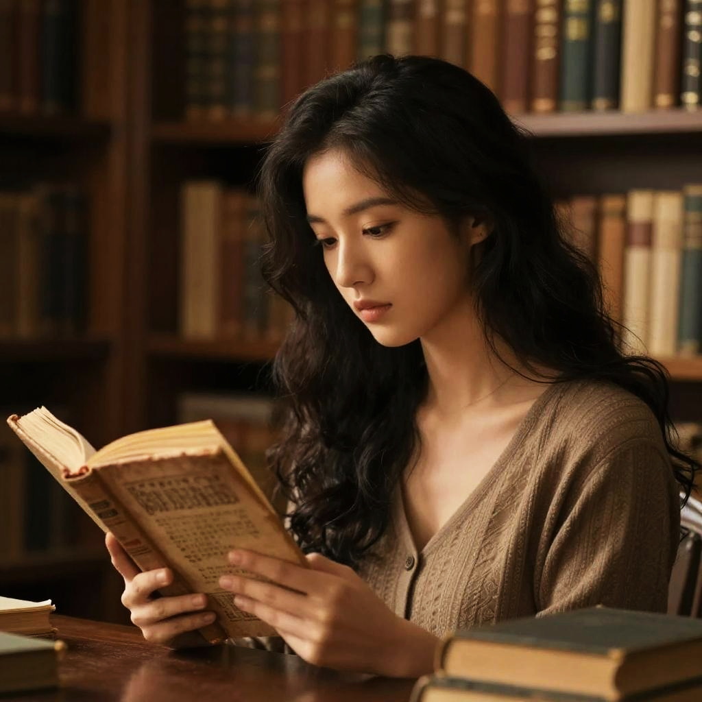 Asian girl with glasses reading a vintage book in a sunlit library, surrounded by tall wooden shelves, warm sunlight highlighting her thoughtful expression, soft focus