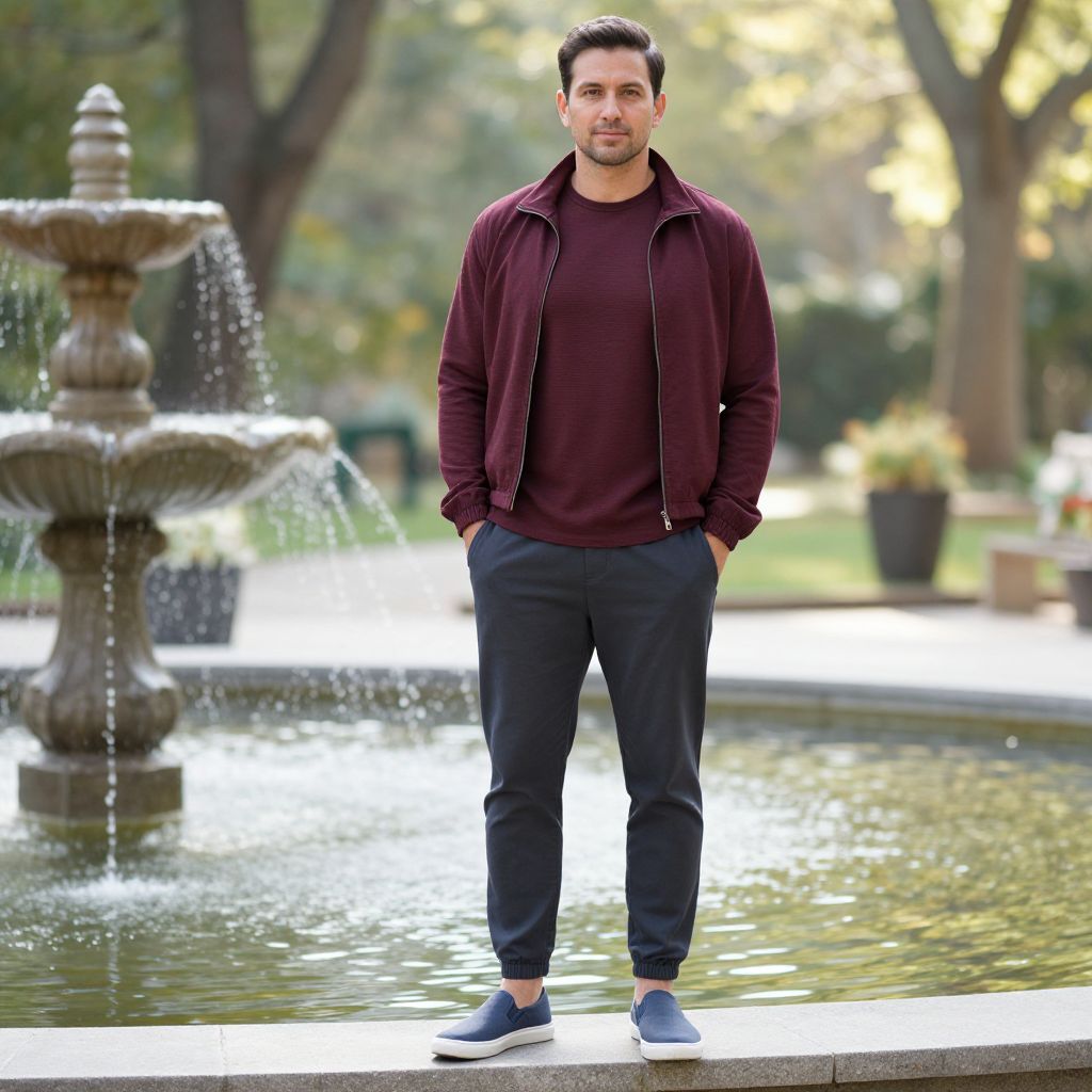 A man, deep burgundy thermal shirt, dark grey jogger trousers, minimalist slip-on sneakers, cropped windbreaker, serene garden, soft sunlight filtering through trees, tranquil water fountain, cinecolor, relaxed pose, slight smile, hands in pockets.Man has masculine face and piercing eyes